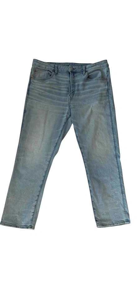 Light wash American Eagle Airflex+ denim men's jeans are size 36 waist and 30 length. Material is 86% cotton, 8% recycled polyester, 5% recycled cotton, and 1% elastane. This pair has classic five-pocket styling and a zip fly.