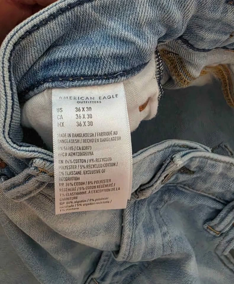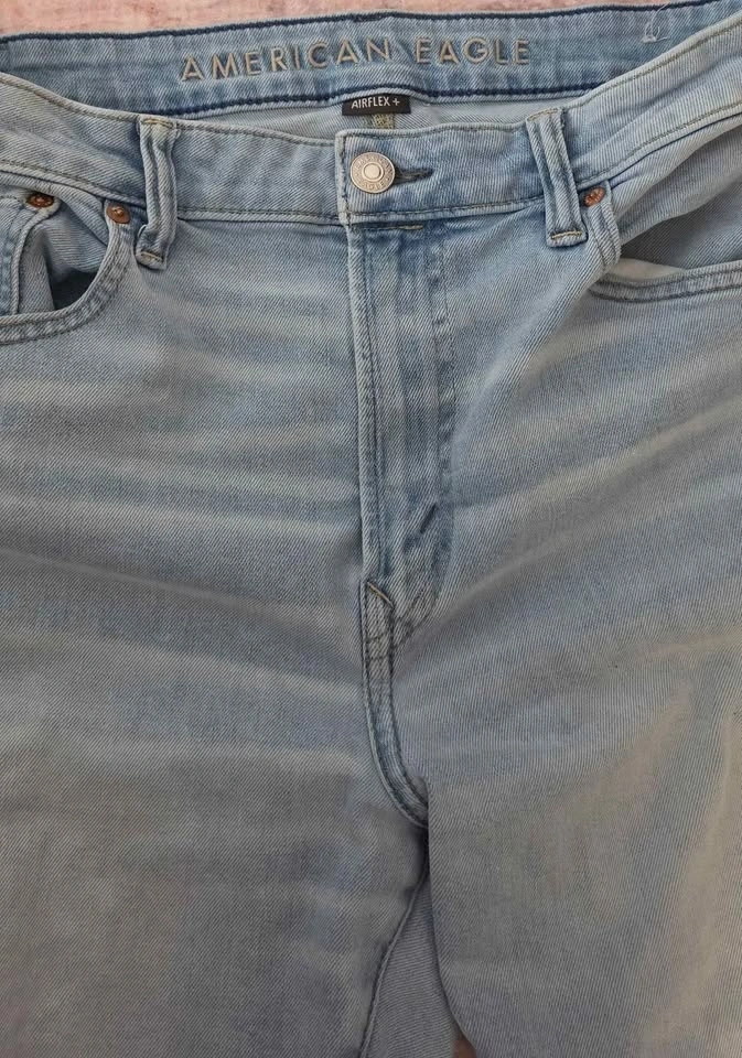 Light wash American Eagle Airflex+ denim men's jeans are size 36 waist and 30 length. Material is 86% cotton, 8% recycled polyester, 5% recycled cotton, and 1% elastane. This pair has classic five-pocket styling and a zip fly.
