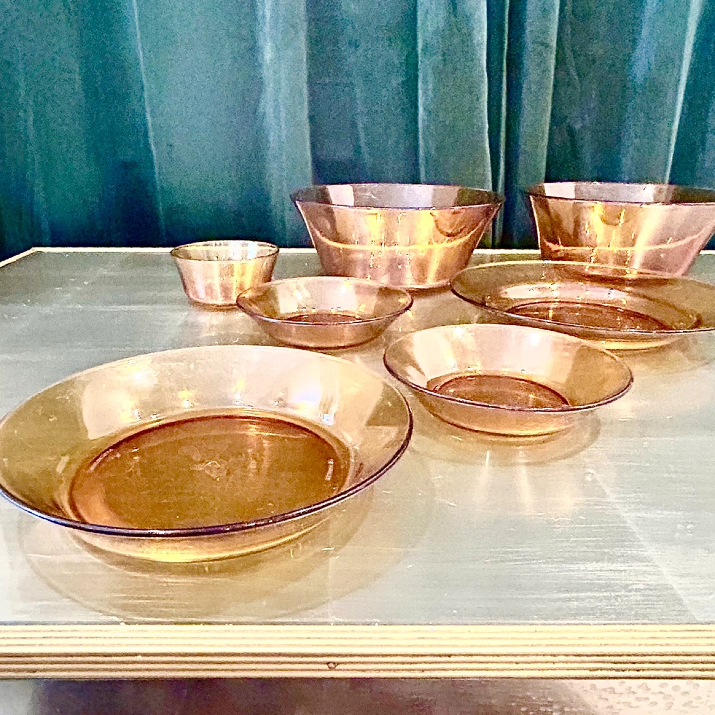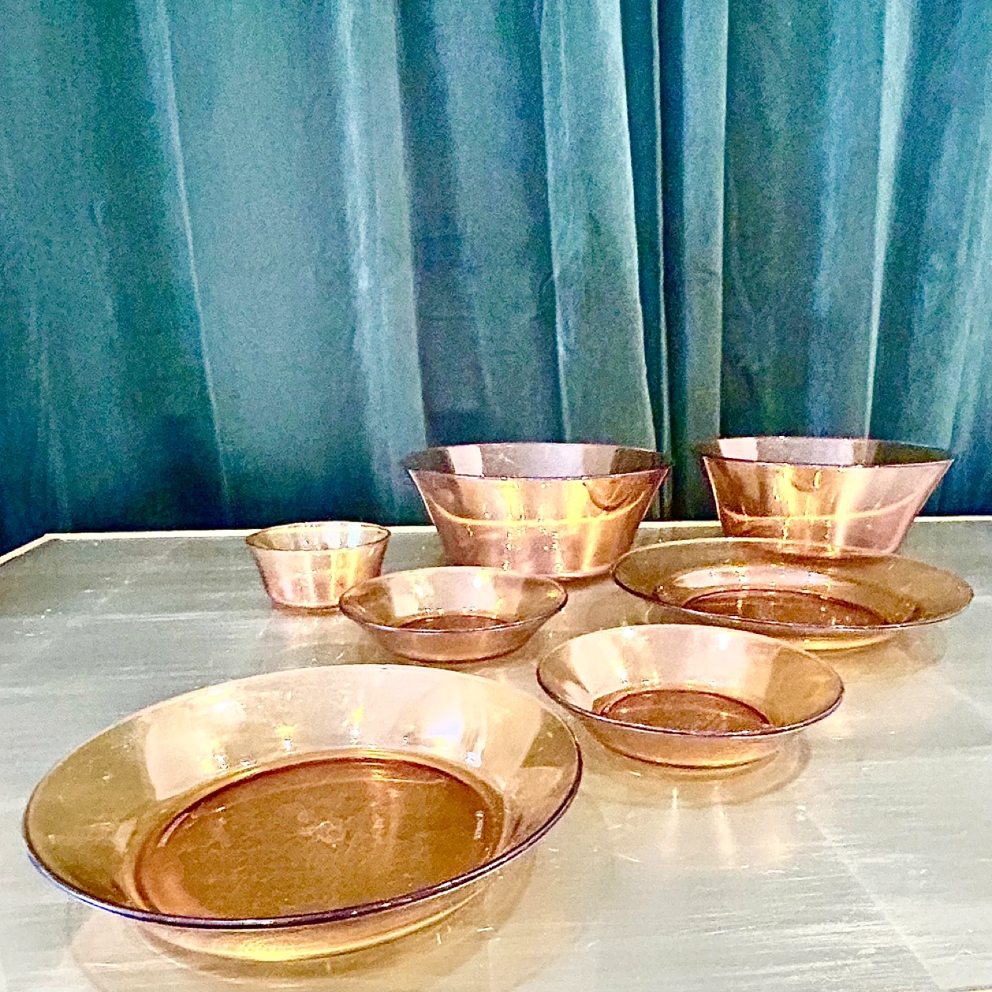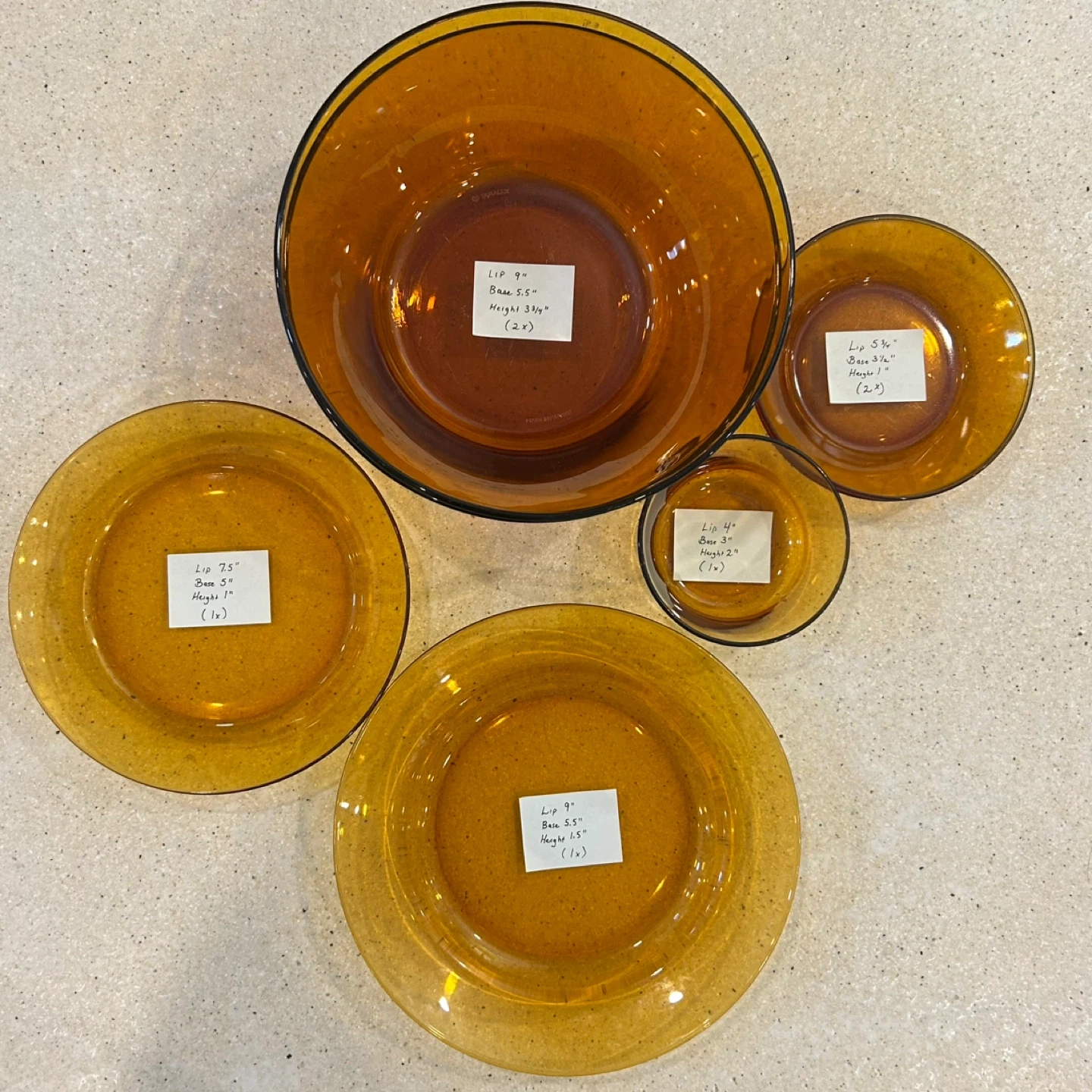 Beautiful warm honey/amber tone with a clean, modernist silhouette that displays like mid-century French tableware. This is a matched set with desirable size variety including two of the deeper 9” bowls plus coordinating smaller bowls—great for collectors, styling, and everyday use.
