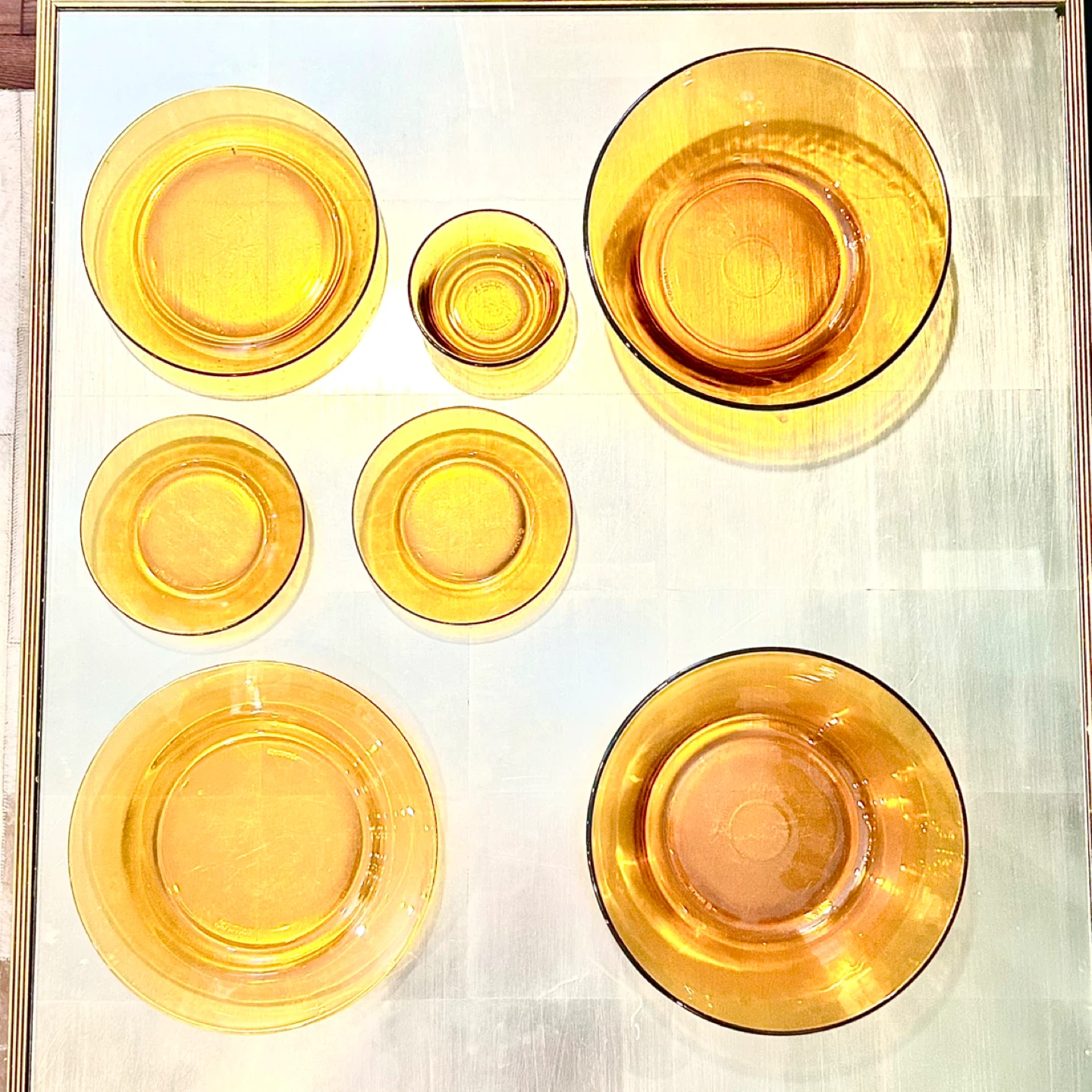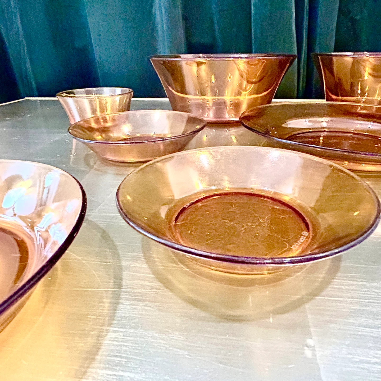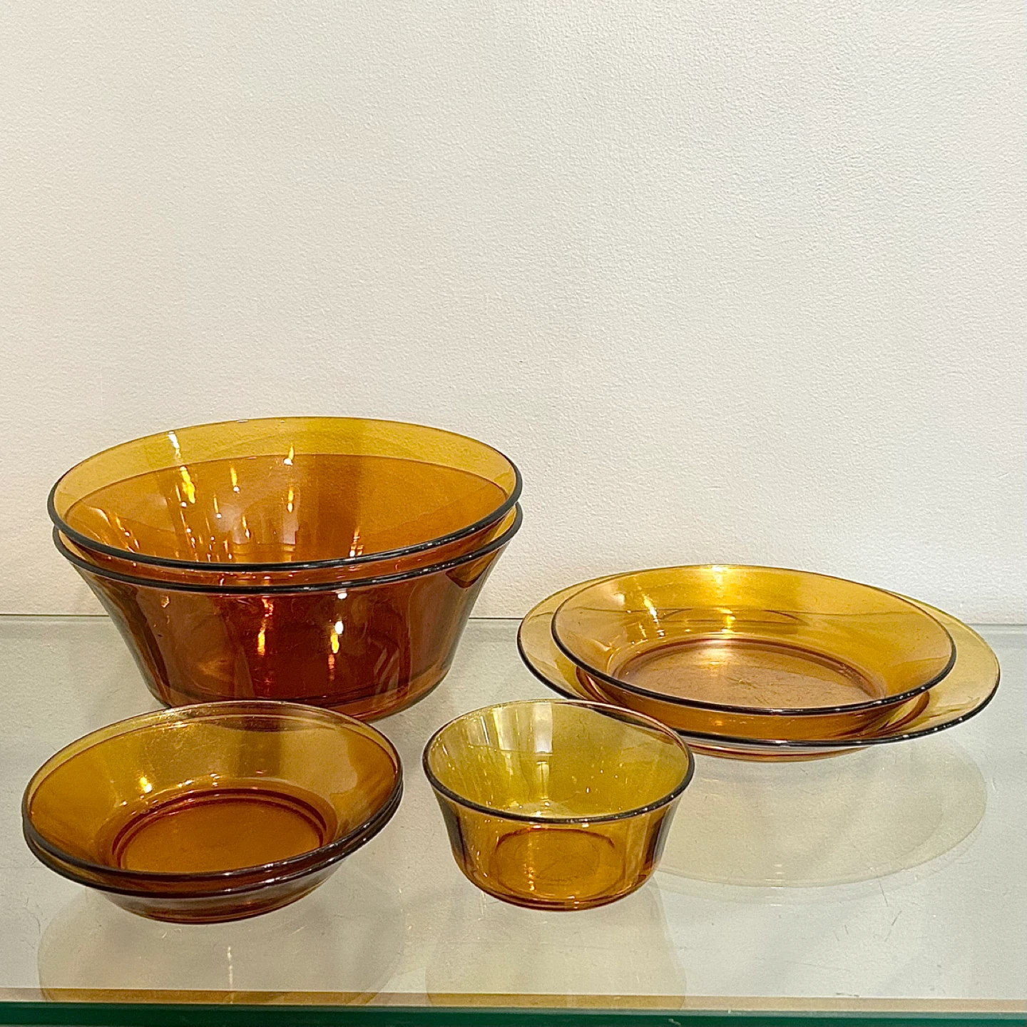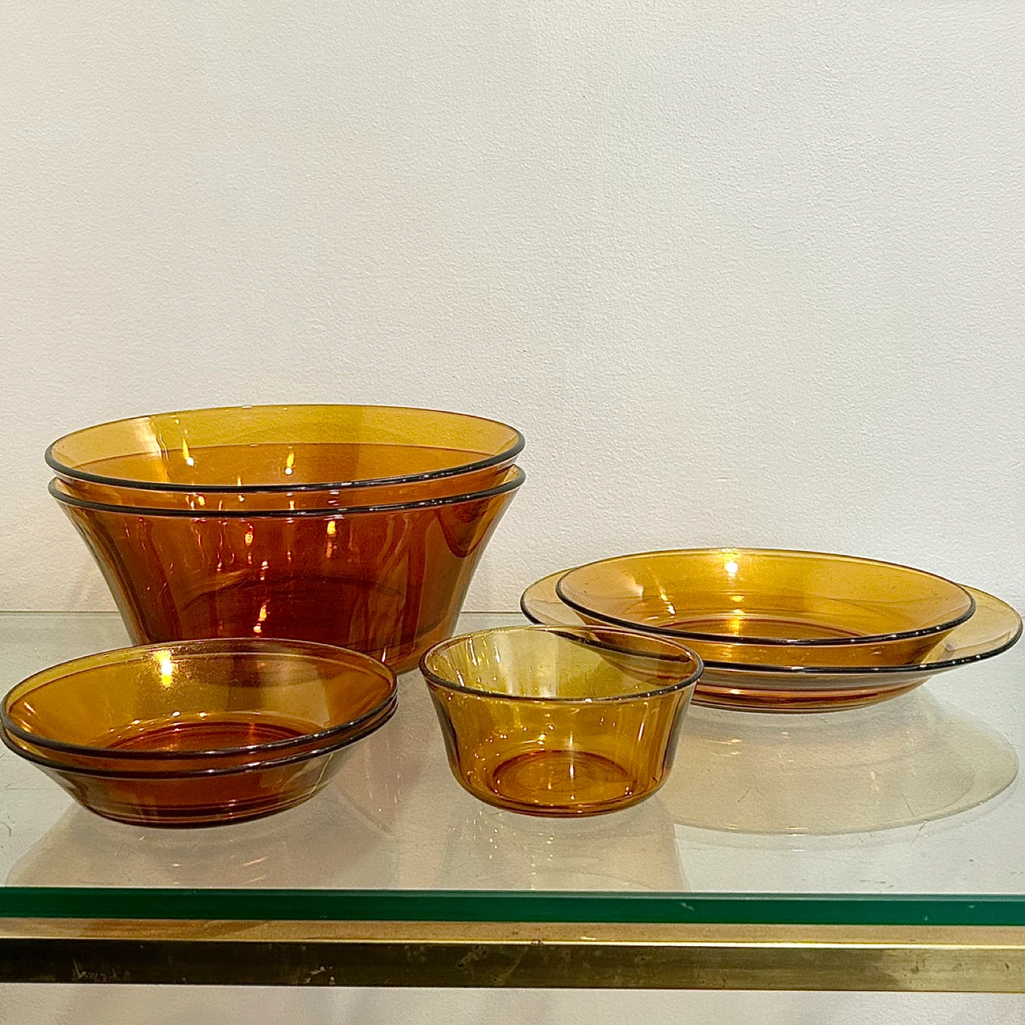 Beautiful warm honey/amber tone with a clean, modernist silhouette that displays like mid-century French tableware. This is a matched set with desirable size variety including two of the deeper 9” bowls plus coordinating smaller bowls—great for collectors, styling, and everyday use.