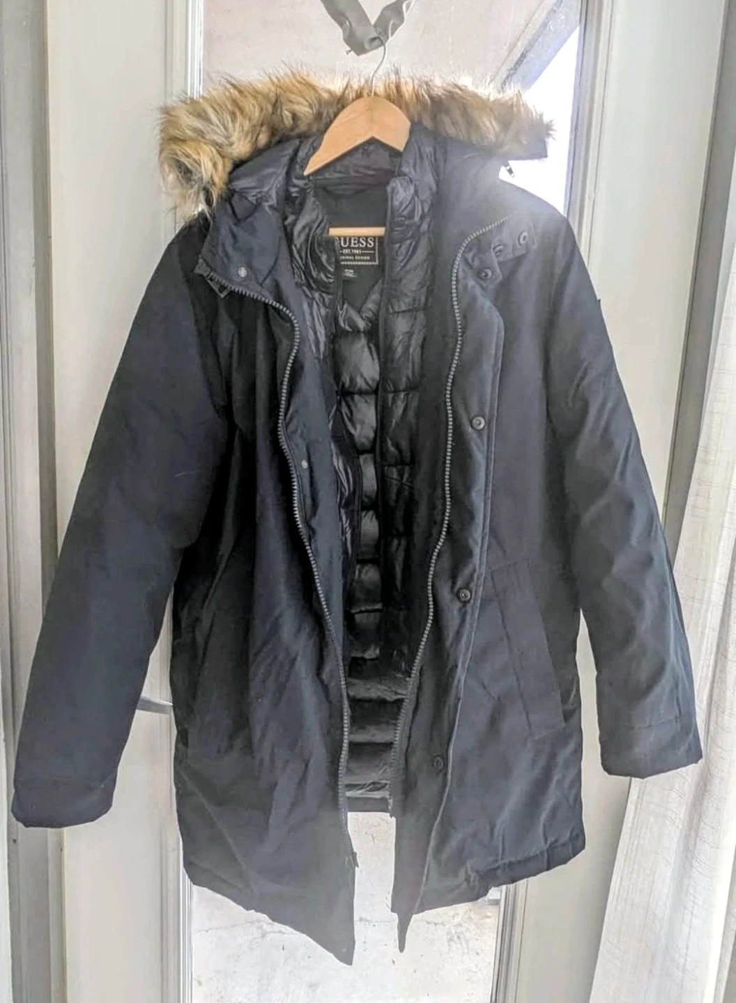 I'm selling a GUESS parka winter jacket in size M. It is dark blue and padded, perfect for the cold weather!