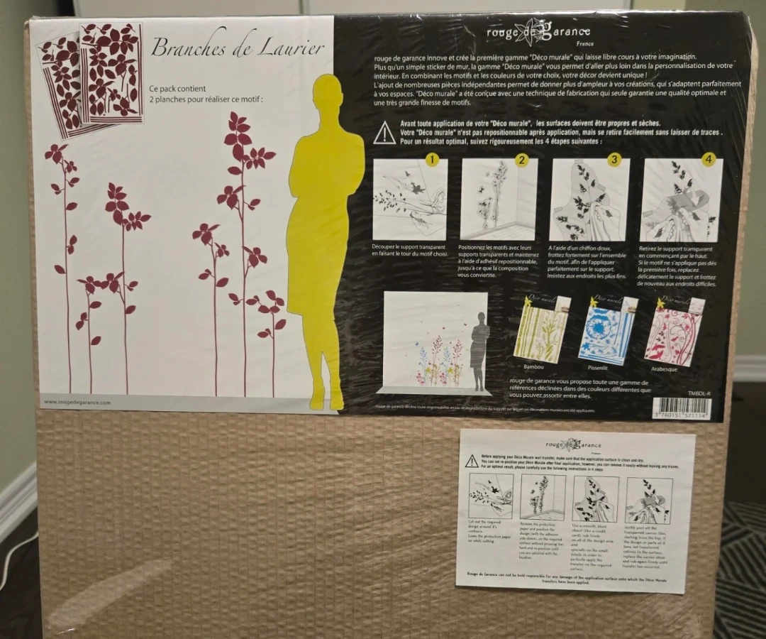 Rouge de Garance Déco Murale features self-adhesive wall stickers with a Laurier Branches motif. This pack includes 2 sheets to create your own design. They're easy to apply to walls, paper, wood, glass, and metal. Perfect for personalizing your living space!