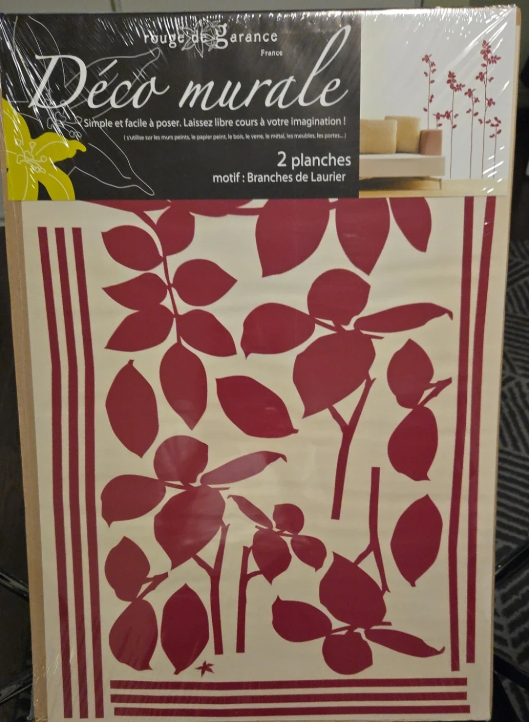 Rouge de Garance Déco Murale features self-adhesive wall stickers with a Laurier Branches motif. This pack includes 2 sheets to create your own design. They're easy to apply to walls, paper, wood, glass, and metal. Perfect for personalizing your living space!