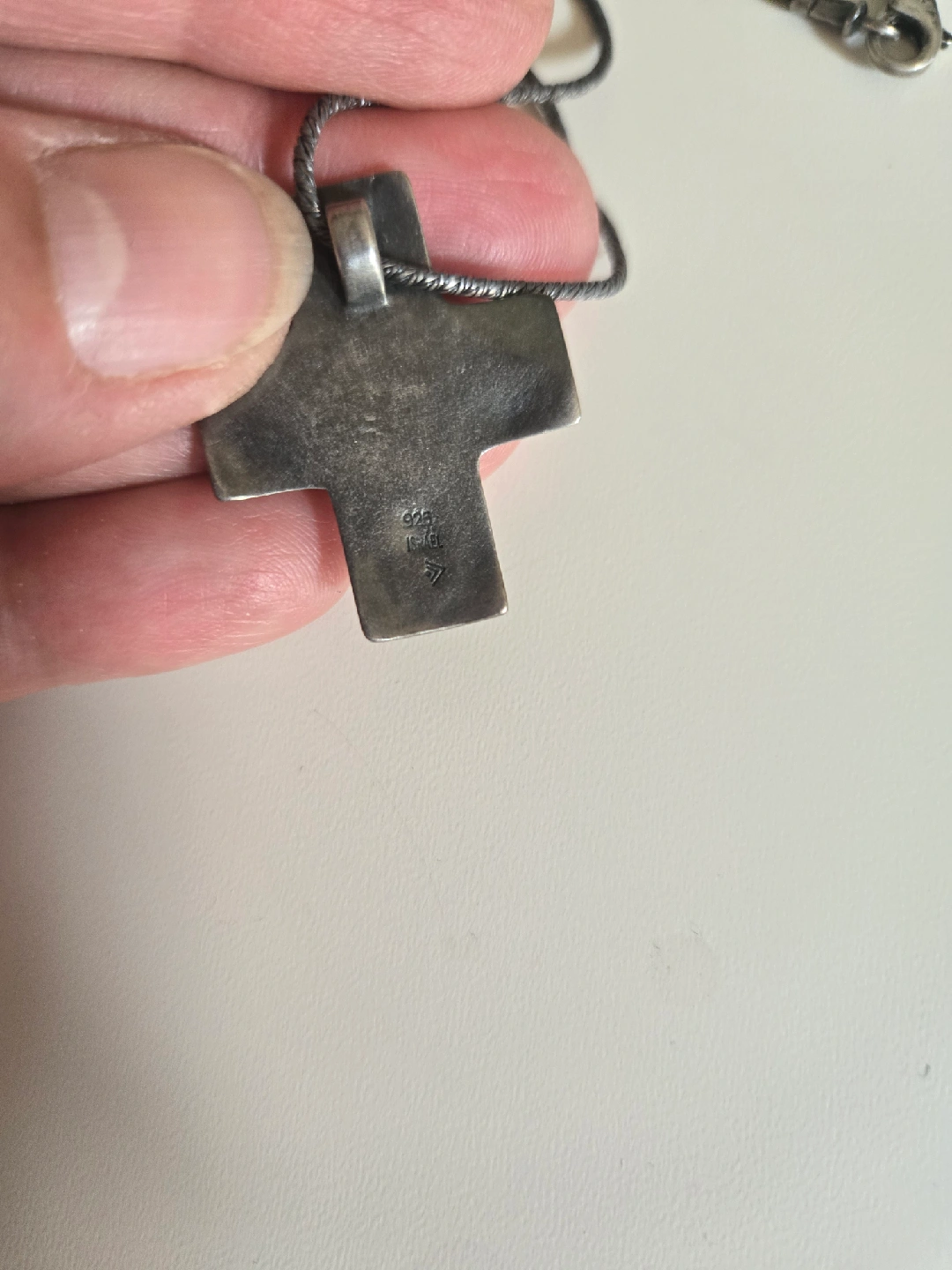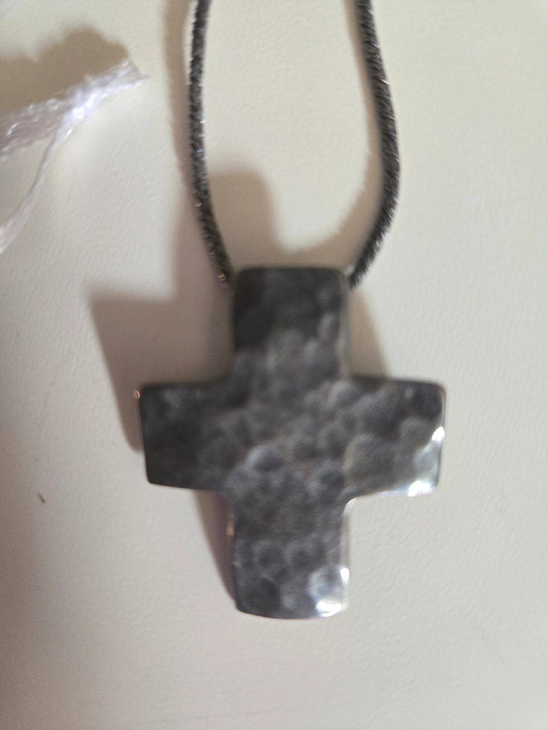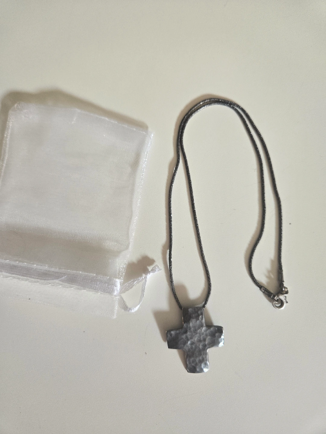 Selling a lovely Silpadasilver cross pendant necklace. The pendant has a hammered texture, giving it a unique and rustic look. It comes with a delicate chain and a small pouch for storage. Perfect for adding a touch of elegance to any outfit!