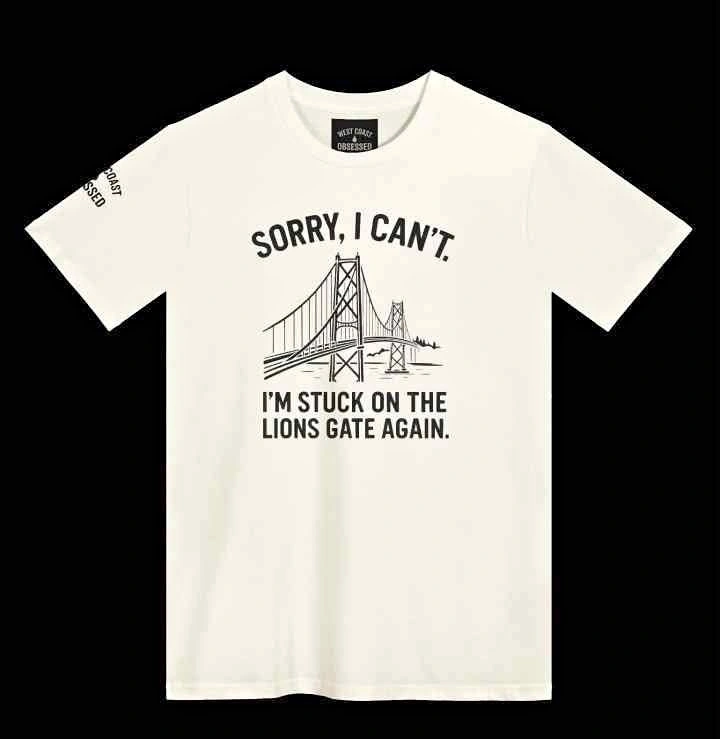 Celebrate Vancouver’s unofficial traffic mascot — the Lions Gate Bridge — with this tee that says what every local’s thinking when they’re running late (again).