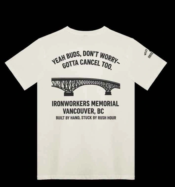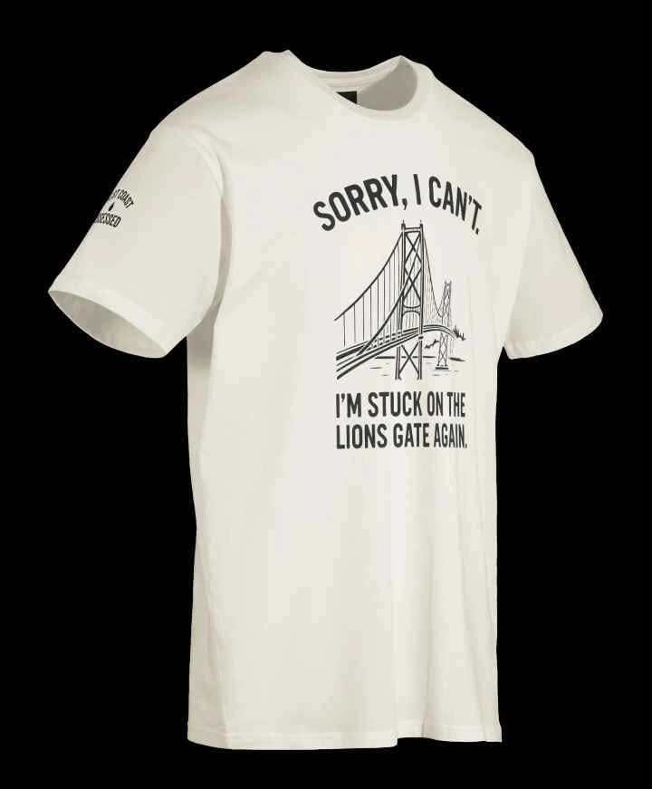 Celebrate Vancouver’s unofficial traffic mascot — the Lions Gate Bridge — with this tee that says what every local’s thinking when they’re running late (again).