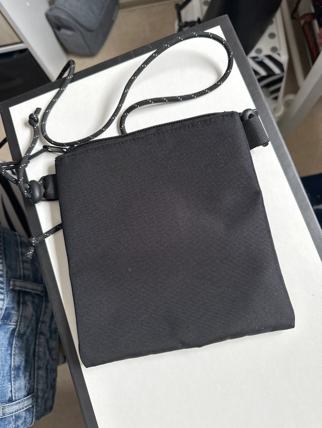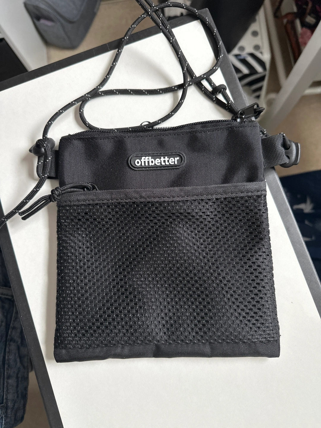 Small black crossbody bag. Features a main zippered compartment and a smaller mesh pocket. Adjustable drawstring strap. Perfect for everyday use.