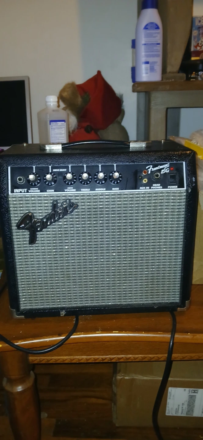 This is a Fender Frontman 15G guitar amplifier. It's black with a silver speaker grille. The amp has input, volume, drive select, gain, treble, middle, bass, and power controls. It also features an aux in and a headphone jack. Its in great condition and works really well like brand new lowest i can take is for for 50 ill come to you
