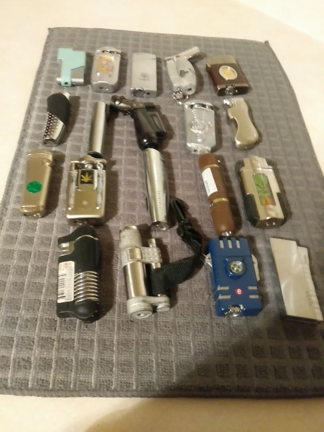 A collection of various lighters, including butane torch lighters and standard models. Some lighters feature decorative designs. This assortment offers a range of styles and functionalities for different needs.