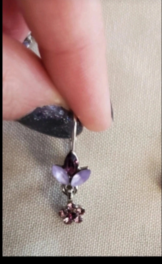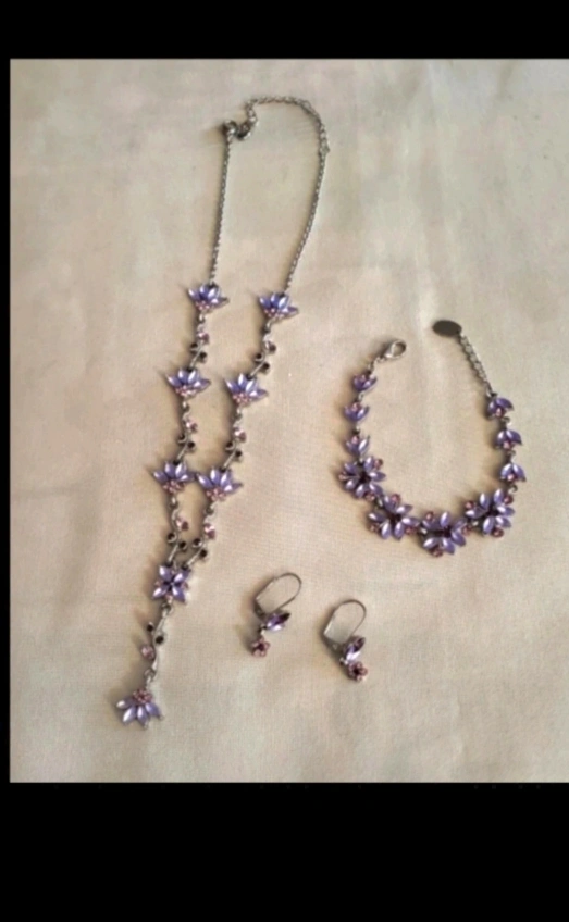 Beautiful purple flower jewelry set. Includes a long necklace, bracelet, and earrings. Silver-toned metal. Perfect for adding a touch of elegance to any outfit.