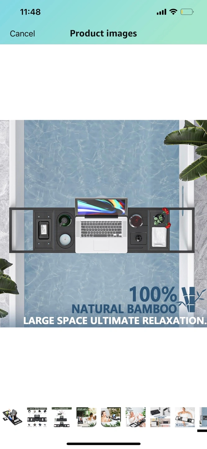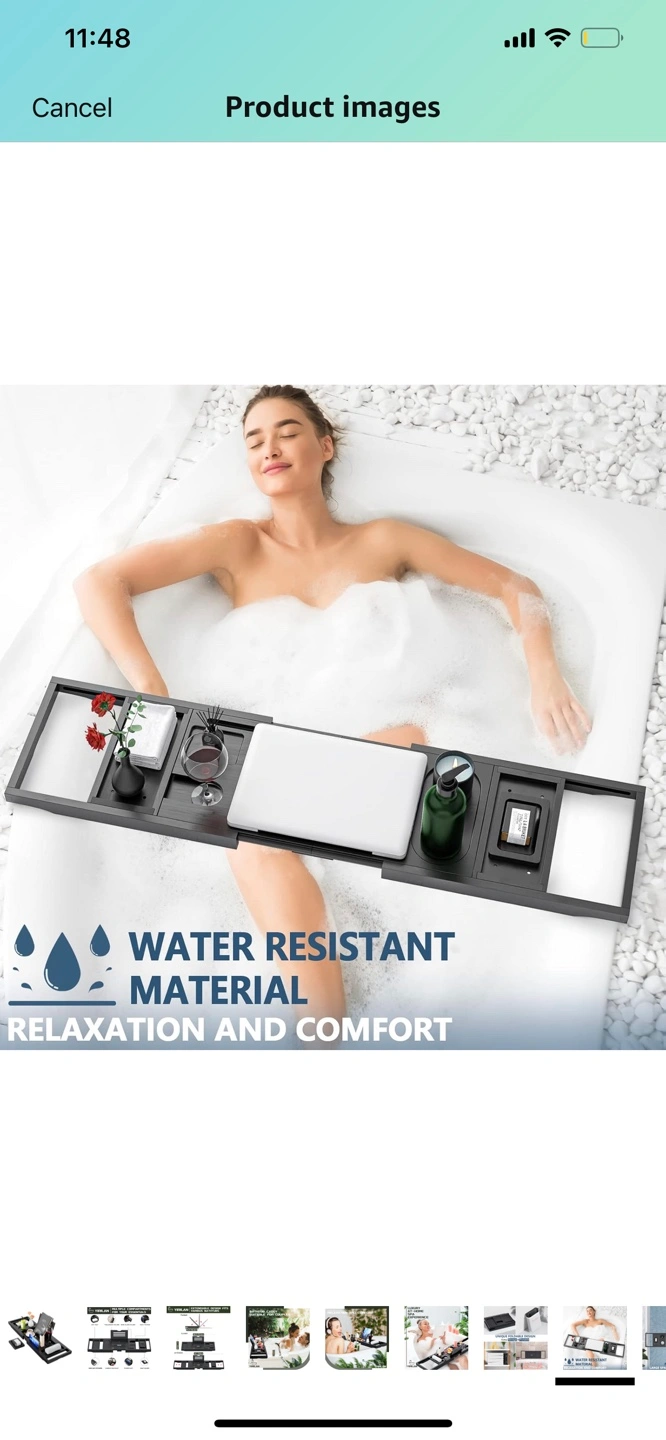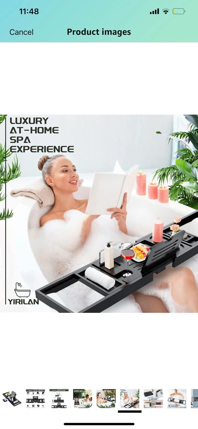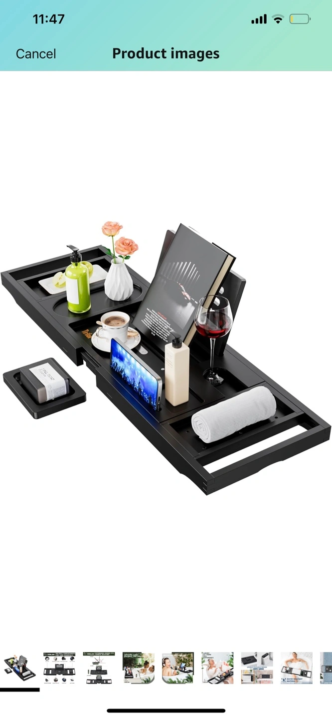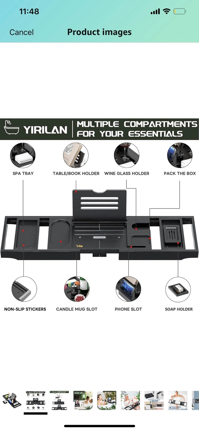 Black bamboo bathtub caddy. Extendable design fits various bathtubs. Multiple compartments for essentials. Includes slots for books, wine glasses, candles, phones, and soap. Folds flat for easy storage. Non-slip stickers included.