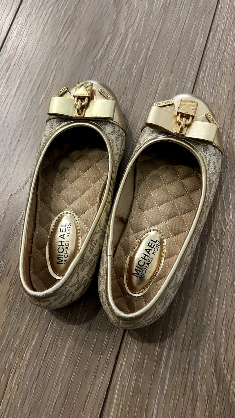 Michael Kors ballet flats for girls. Tan and white MK print. Gold buckle detail on the toe. Quilted insole. Size USA11 ,10.5 US, 29 EUR, 17 CM.