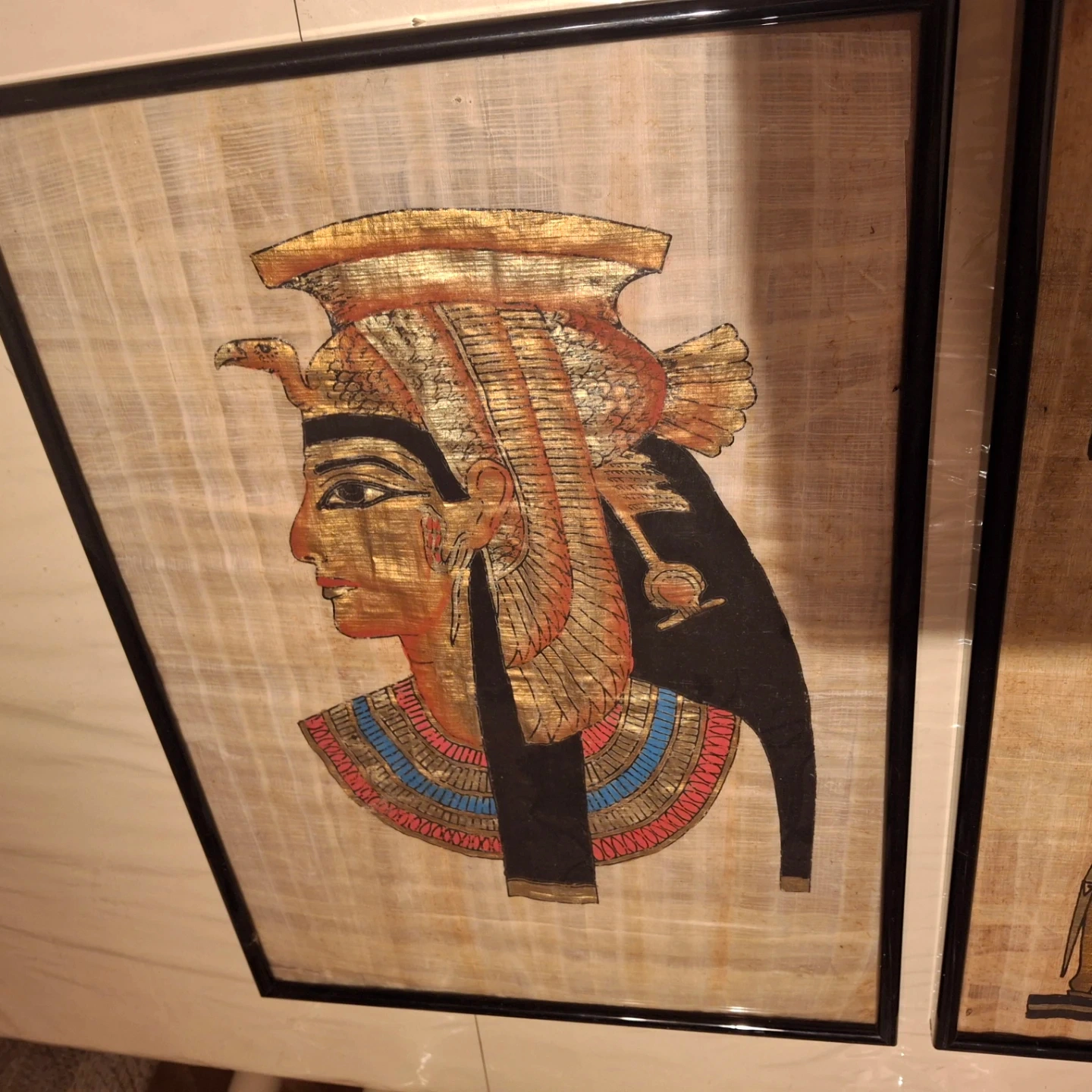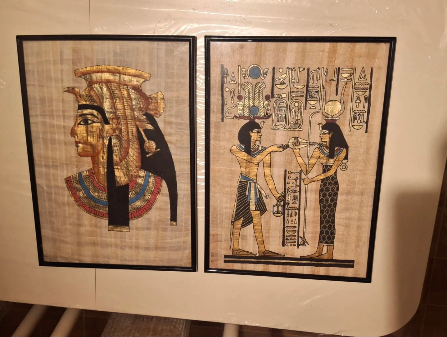 Two framed papyrus art pieces featuring Egyptian imagery. One depicts a profile of a pharaoh, while the other shows two figures and hieroglyphs. They're framed and ready for display.