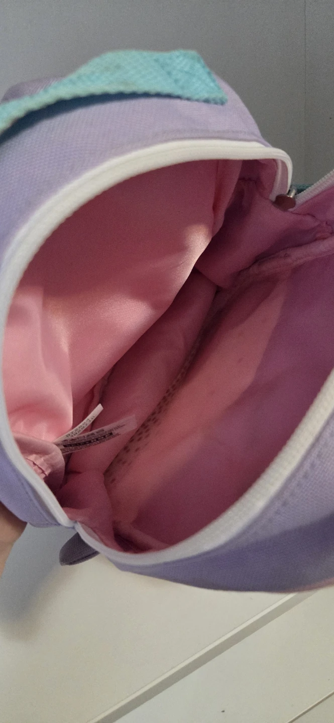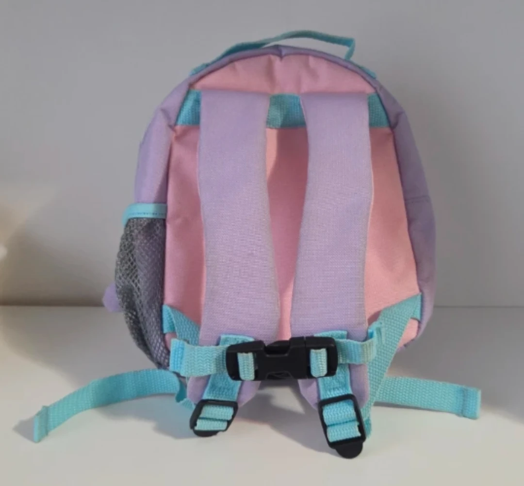 Super cute lavender narwhal backpack for little ones! It's got adjustable straps, a zippered pocket, and a side mesh pocket. Perfect for carrying snacks or small toys. Machine washable.