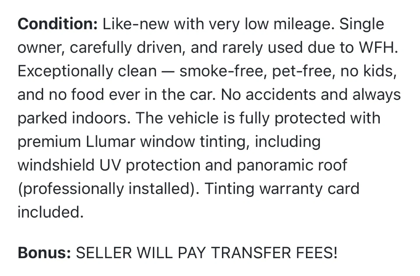 ✅The vehicle is fully protected with premium Llumar window tinting, including windshield UV protection and panoramic roof (professionally installed). Tinting warranty card included.