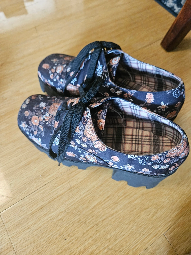 These floral platform shoes are super cute and in great condition! They feature a unique floral pattern and a comfortable platform sole. Perfect for adding a touch of style to any outfit!
