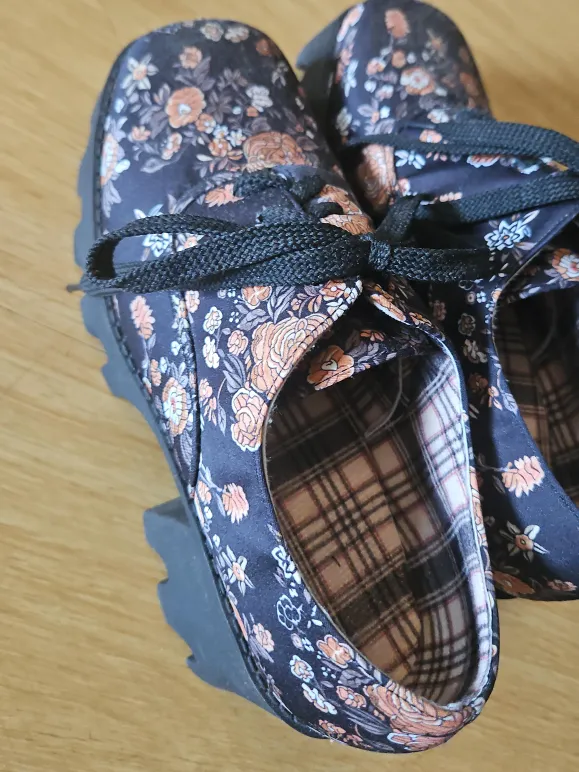 These floral platform shoes are super cute and in great condition! They feature a unique floral pattern and a comfortable platform sole. Perfect for adding a touch of style to any outfit!