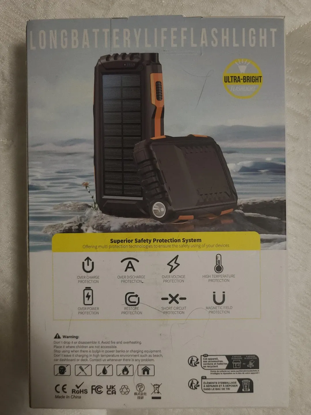 Selling a long battery life flashlight with ultra-bright functionality! The box highlights its superior safety protection system, offering multi-protection technologies. It includes overcharge, over-discharge, over-voltage, and high-temperature protection, as well as over-power, restore, short circuit, and magnetic field protection. I tested it but haven't used it on anything.