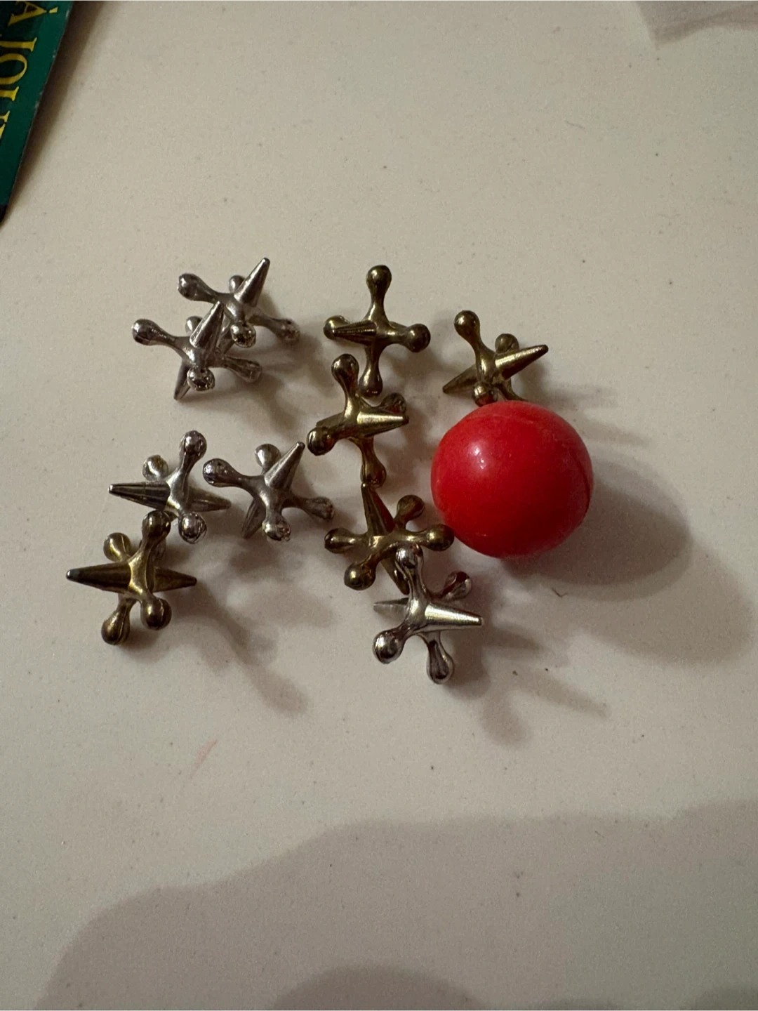 Classic jacks game set with metal pieces and red rubber ball. A fun, nostalgic game that’s great for kids or anyone who remembers playing growing up.