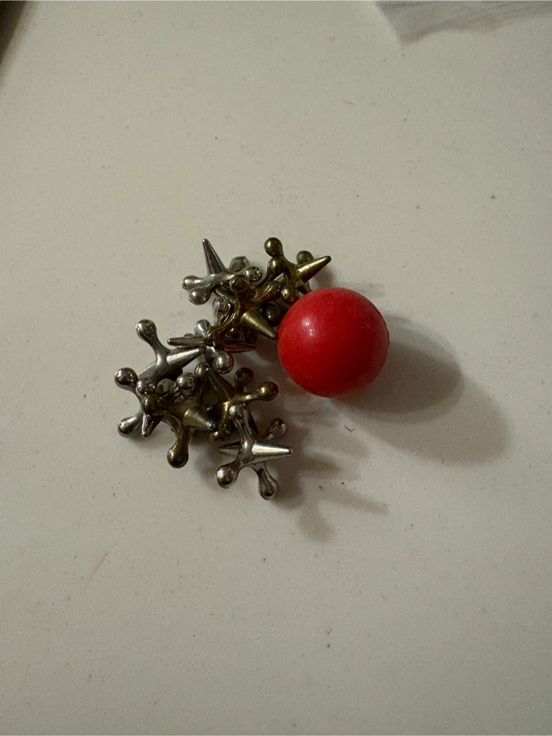 Classic jacks game set with metal pieces and red rubber ball. A fun, nostalgic game that’s great for kids or anyone who remembers playing growing up.