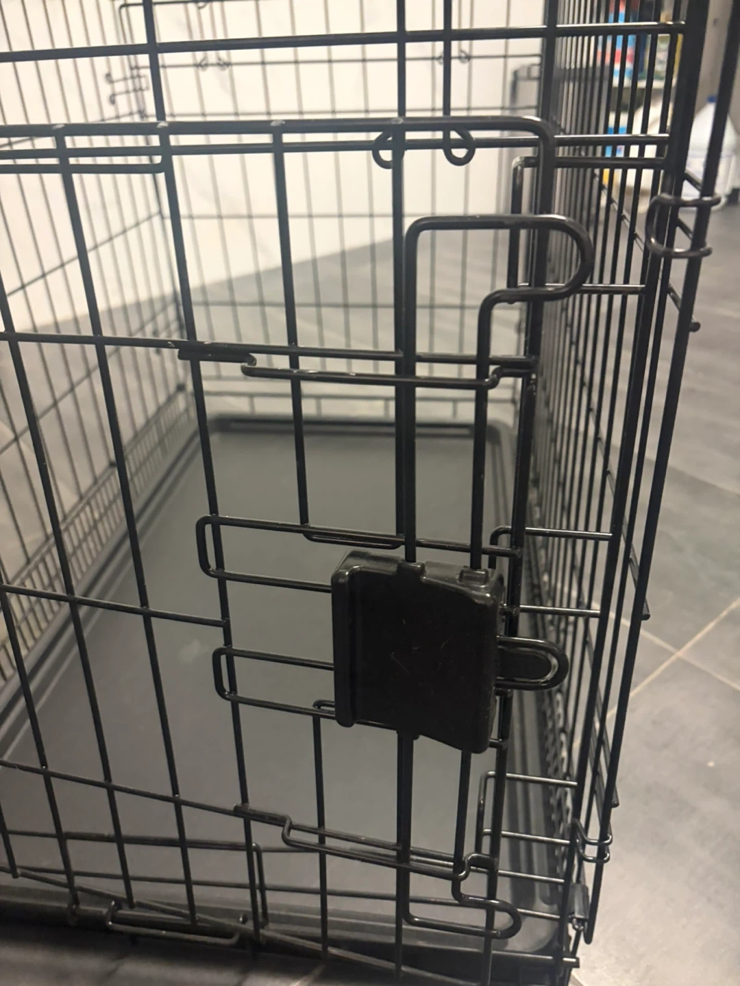 This is a sturdy black wire dog crate. It features a secure latch on the front door. A plastic tray is included for easy cleanup.