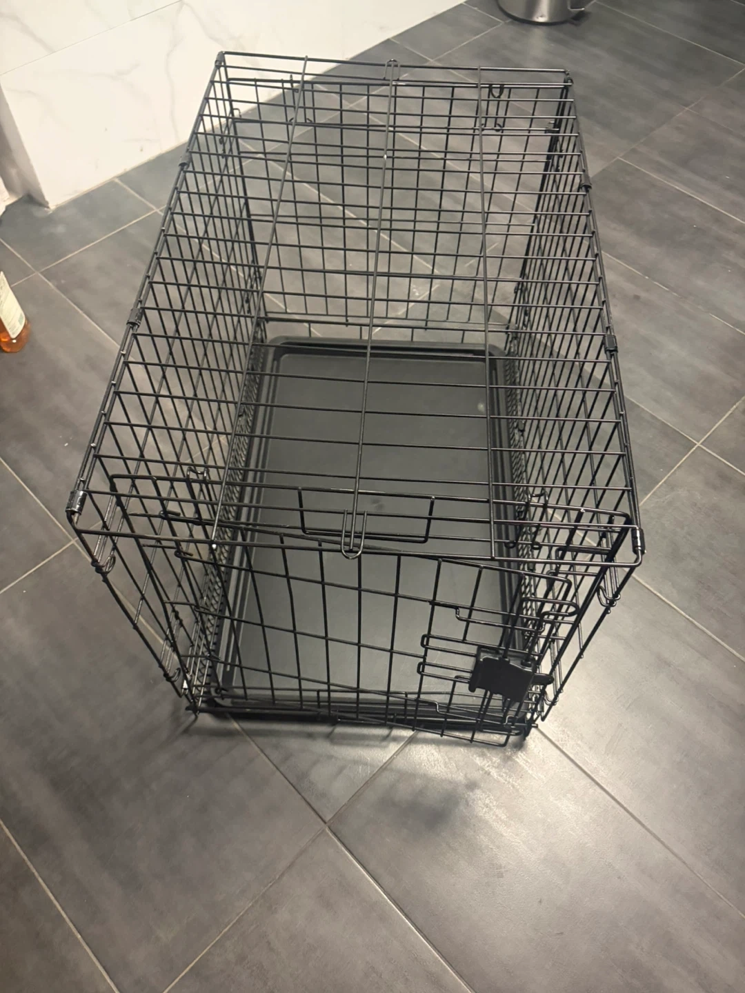 This is a sturdy black wire dog crate. It features a secure latch on the front door. A plastic tray is included for easy cleanup.