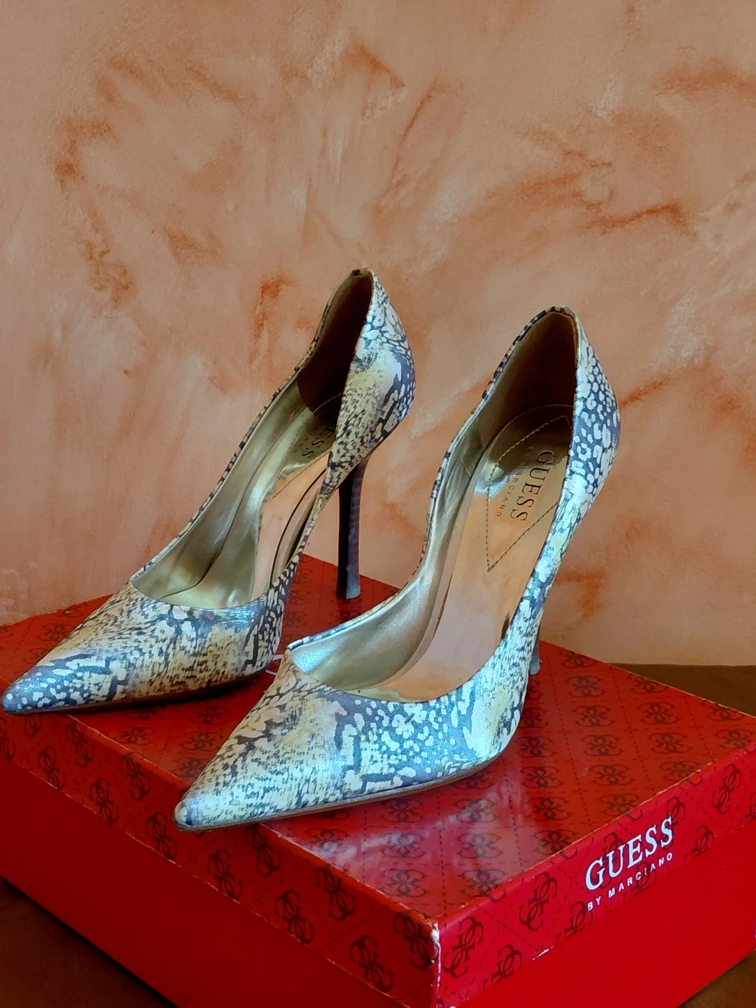Guess By Marciano women's high heel pumps in a snakeskin print. Features a pointed toe and stiletto heel. Includes original box.