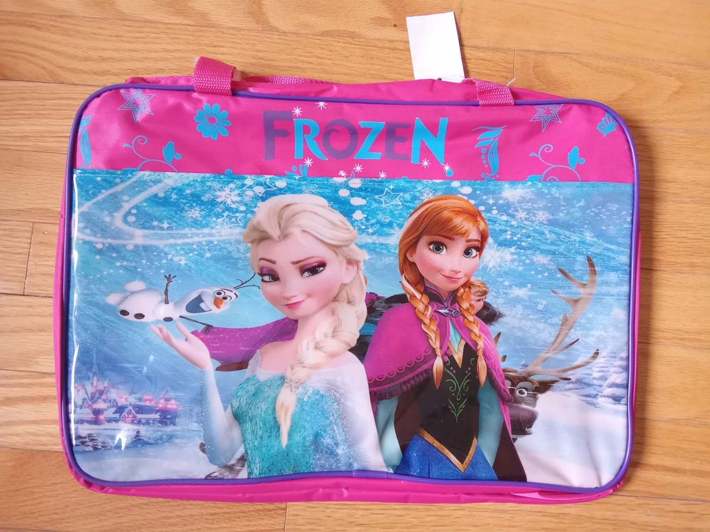 This pink bag features Elsa and Anna from Disney's Frozen. It has a zippered main compartment and two carrying handles.