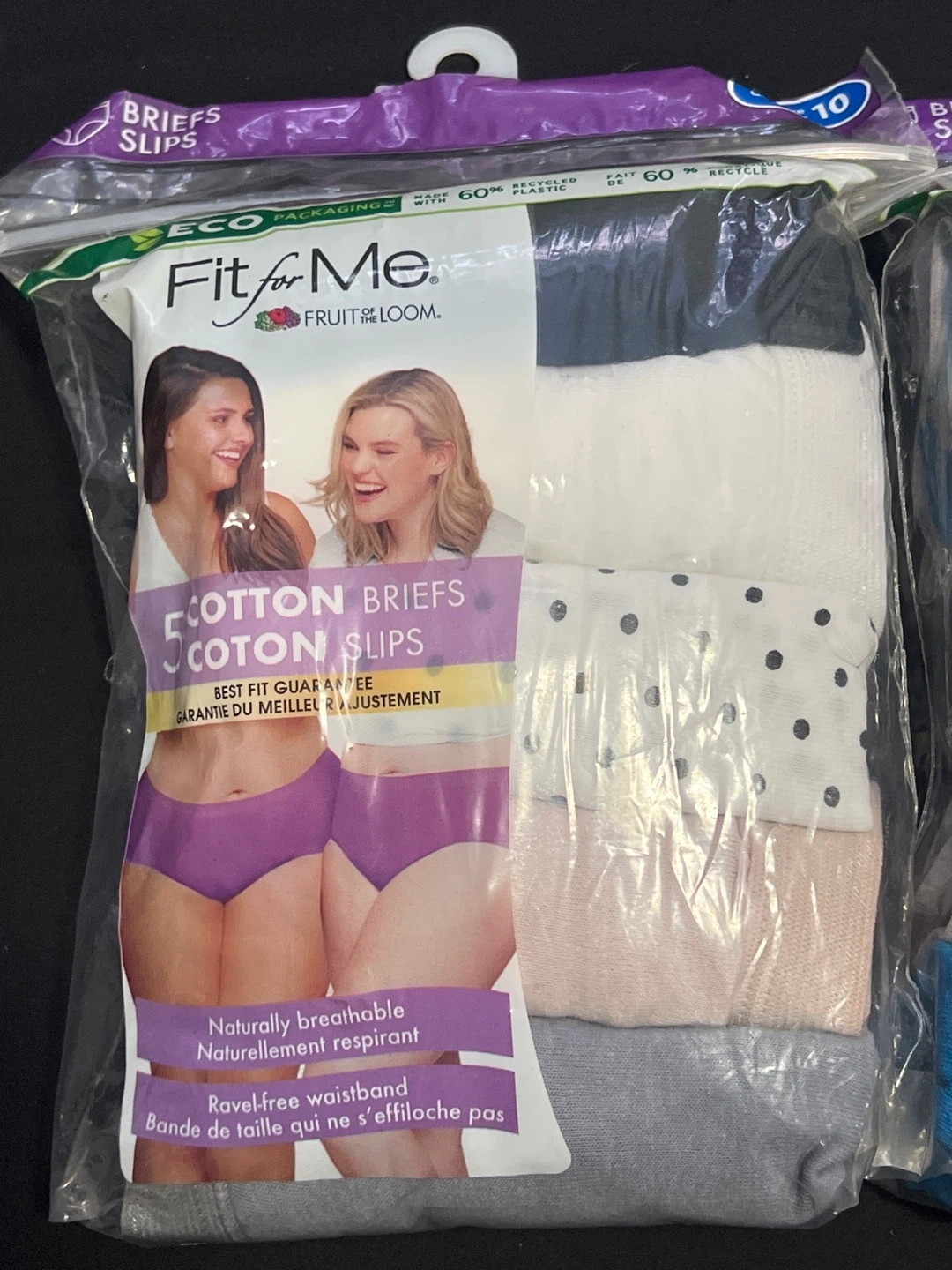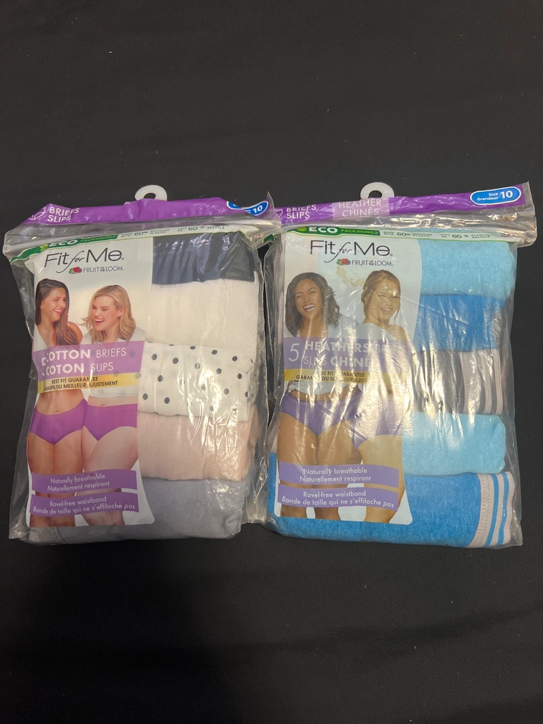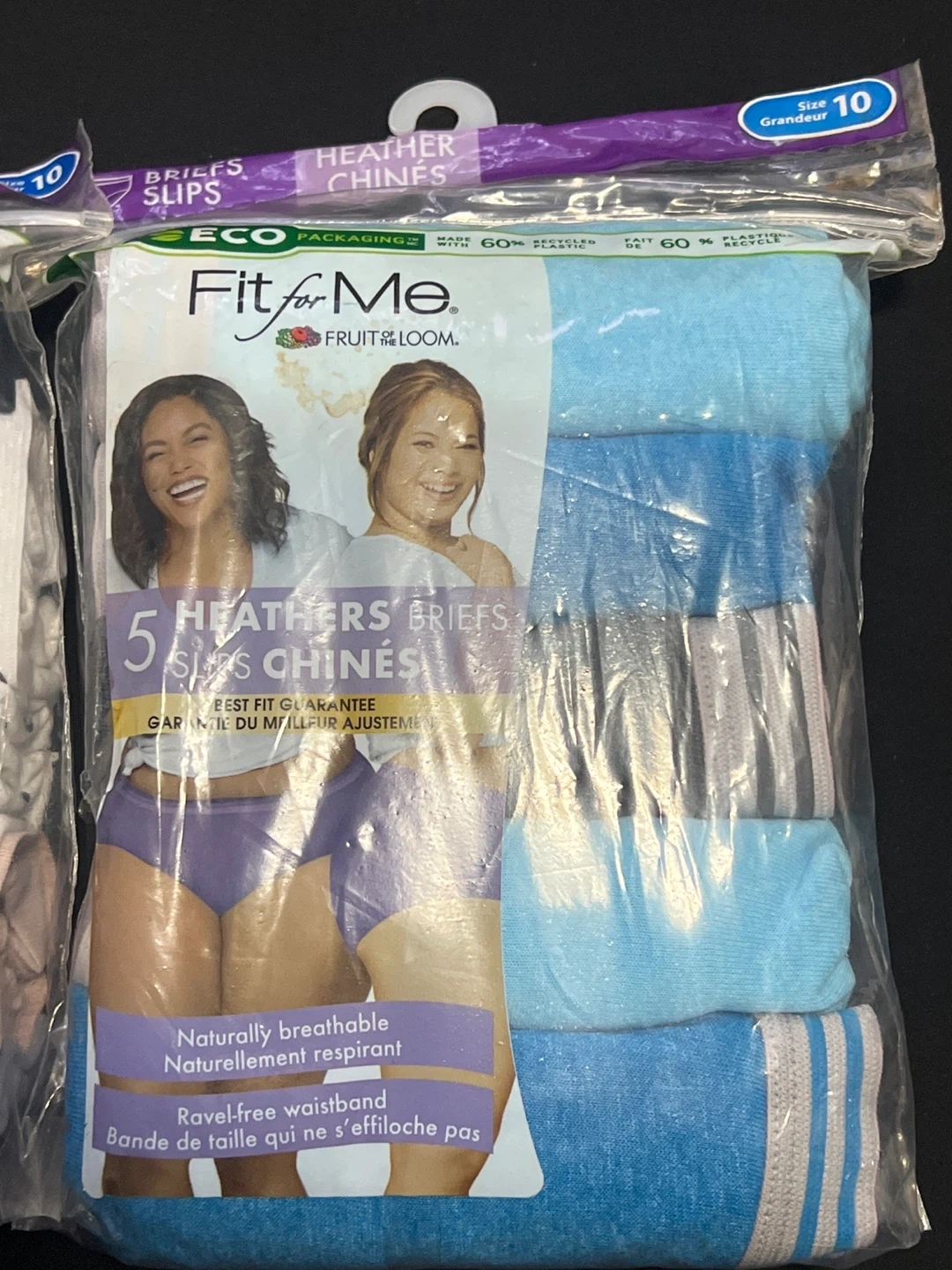 Selling two packs of Fruit of the Loom Fit for Me briefs. Both are size 10 and are brand new in the original packaging. One pack contains 5 cotton briefs, and the other contains 5 heather briefs. They feature a ravel-free waistband and are naturally breathable, perfect for everyday comfort