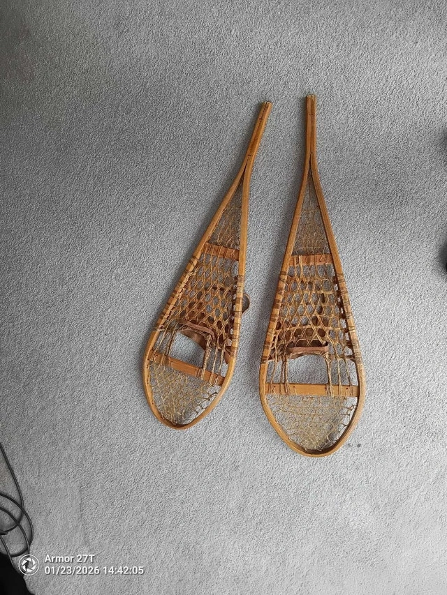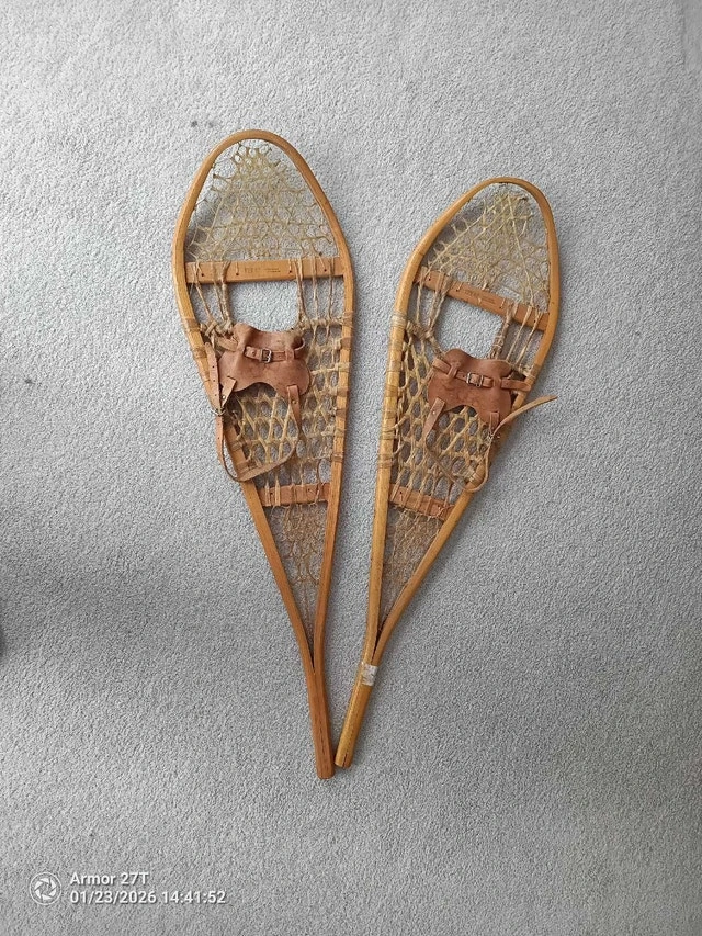 These snowshoes feature a classic design with sturdy wooden frames and intricate woven netting, perfect for winter adventures. The leather bindings are still in good shape, ready to attach to your winter boots. They show signs of wear but are structurally sound. Cash accepted.