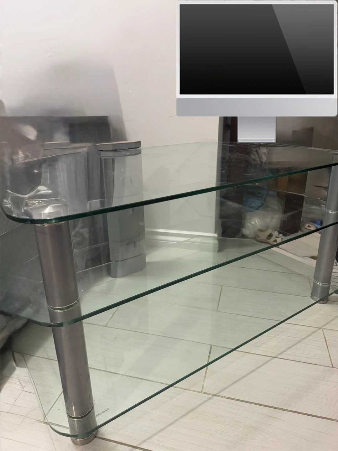 This is a three-tier glass TV stand with metal legs. It offers ample space for your entertainment devices. The clear glass and silver metal construction complement modern decor.
