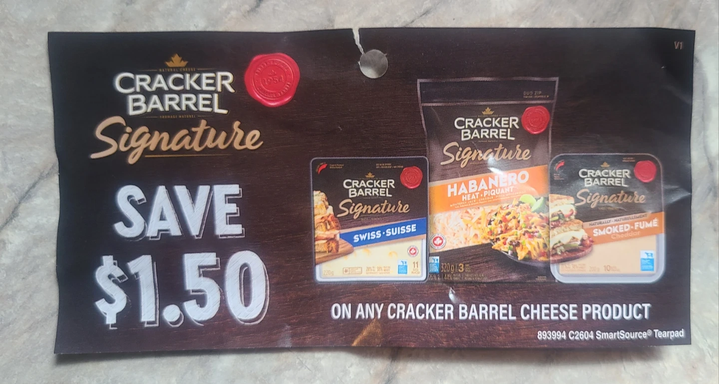 Save $1.50 on any Cracker Barrel cheese product. This coupon is for the Signature line, featuring Swiss, Habanero, and Smoked Cheddar varieties. Expires on June 30 2026