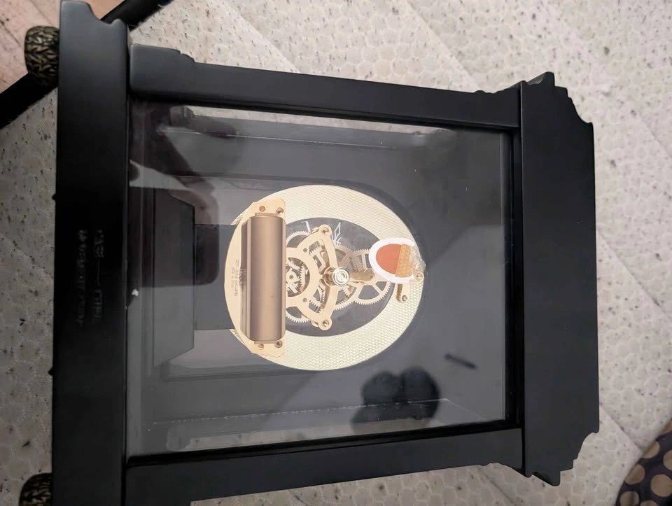 This is a David Peterson Mantel Skeleton Clock, likely model SKC13, featuring a distinctive dark wood case. It has an oval skeleton movement with an exposed brass gear assembly and a dark wooden arched frame. Features include a Roman chapter ring with an integrated second-hand dial display. The movement is typically battery-operated quartz for timekeeping. Dimensions are approximately 10.5 inches high, 8.25 inches wide, and 4 inches deep. Feel free to message if you have any questions!