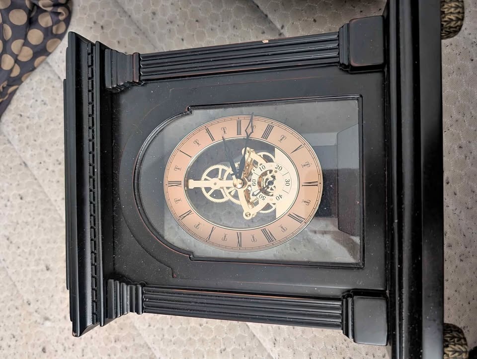 This is a David Peterson Mantel Skeleton Clock, likely model SKC13, featuring a distinctive dark wood case. It has an oval skeleton movement with an exposed brass gear assembly and a dark wooden arched frame. Features include a Roman chapter ring with an integrated second-hand dial display. The movement is typically battery-operated quartz for timekeeping. Dimensions are approximately 10.5 inches high, 8.25 inches wide, and 4 inches deep. Feel free to message if you have any questions!