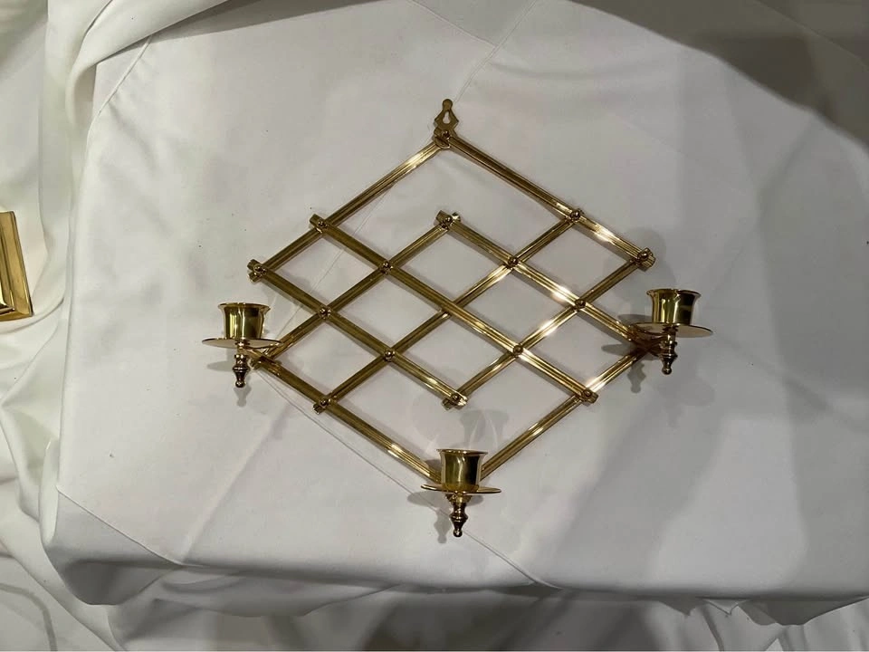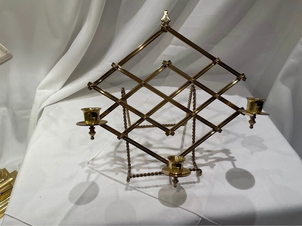 Beautiful Brass Accordion Diamond Lattice Scone. Pristine condition, holds 3 candles. Height 11", Width 13". From a smoke & pet-free home. Limited edition #319/600. Available for cash in Richmond Hill (Bathurst & King Rd).