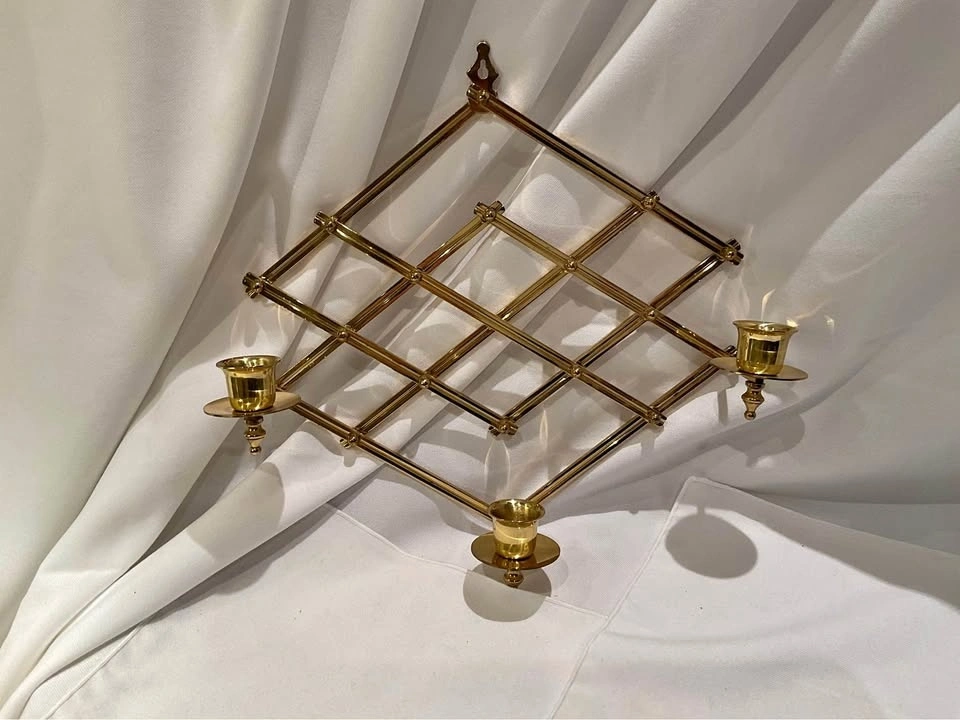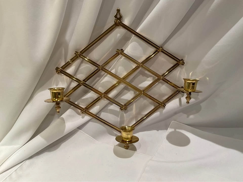 Beautiful Brass Accordion Diamond Lattice Scone. Pristine condition, holds 3 candles. Height 11", Width 13". From a smoke & pet-free home. Limited edition #319/600. Available for cash in Richmond Hill (Bathurst & King Rd).