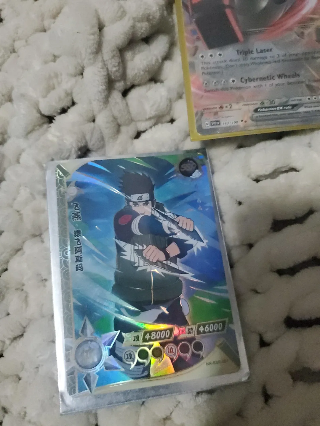 This is a "飛燕・猿飛阿斯碼" card from Naruto. It has attack values of 48000 and defence values of 46000. It is a collectible card for fans.