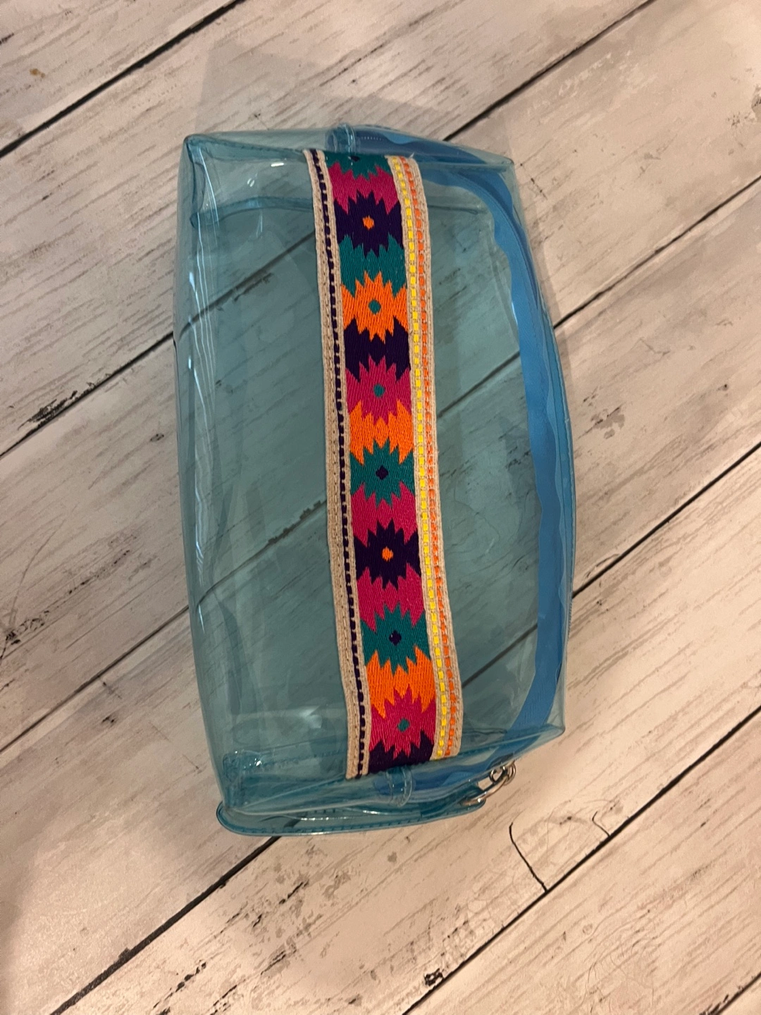 This clear blue cosmetic bag has a zippered closure. It's decorated with a colourful woven trim. Great for organizing makeup or toiletries!