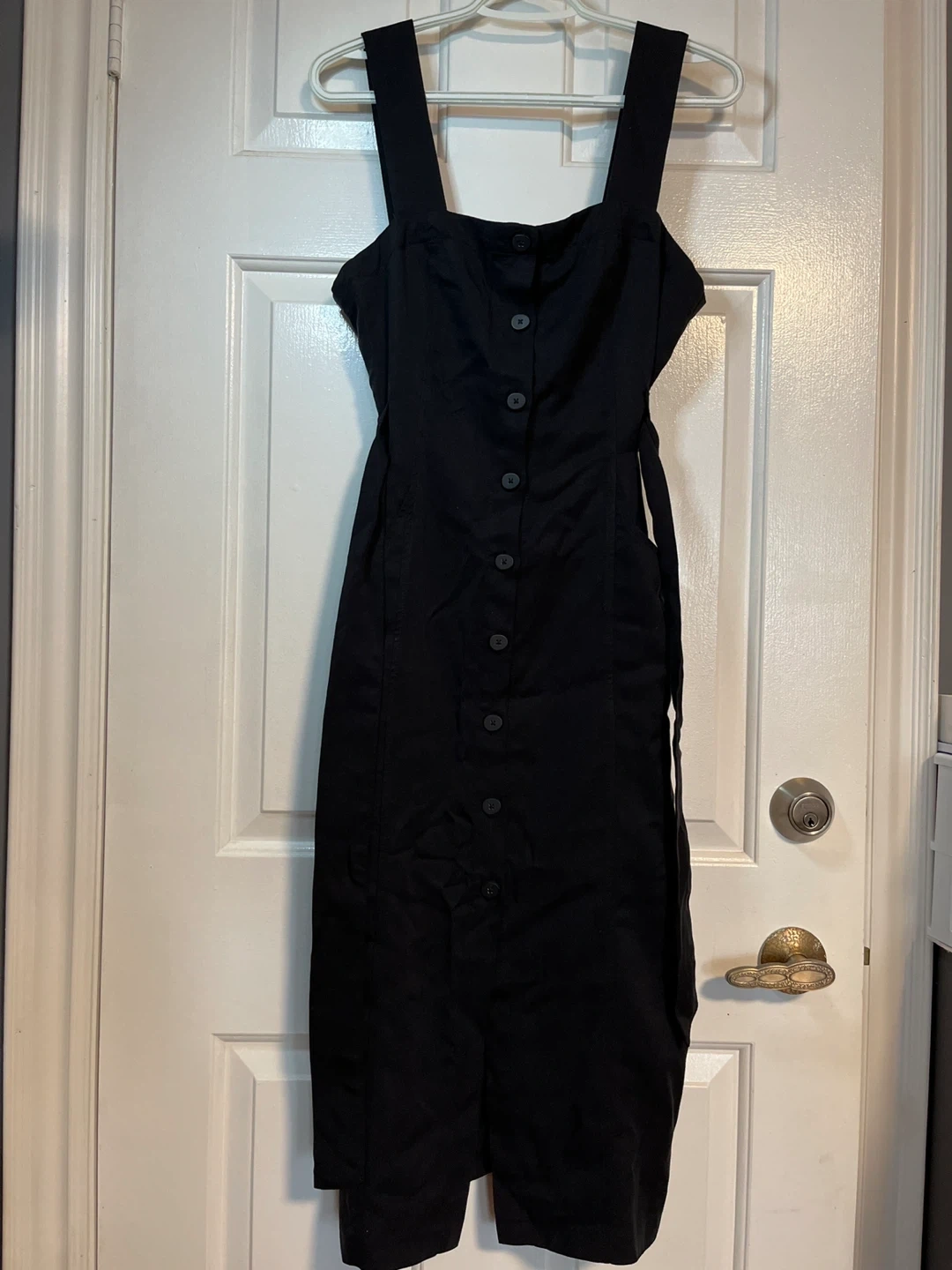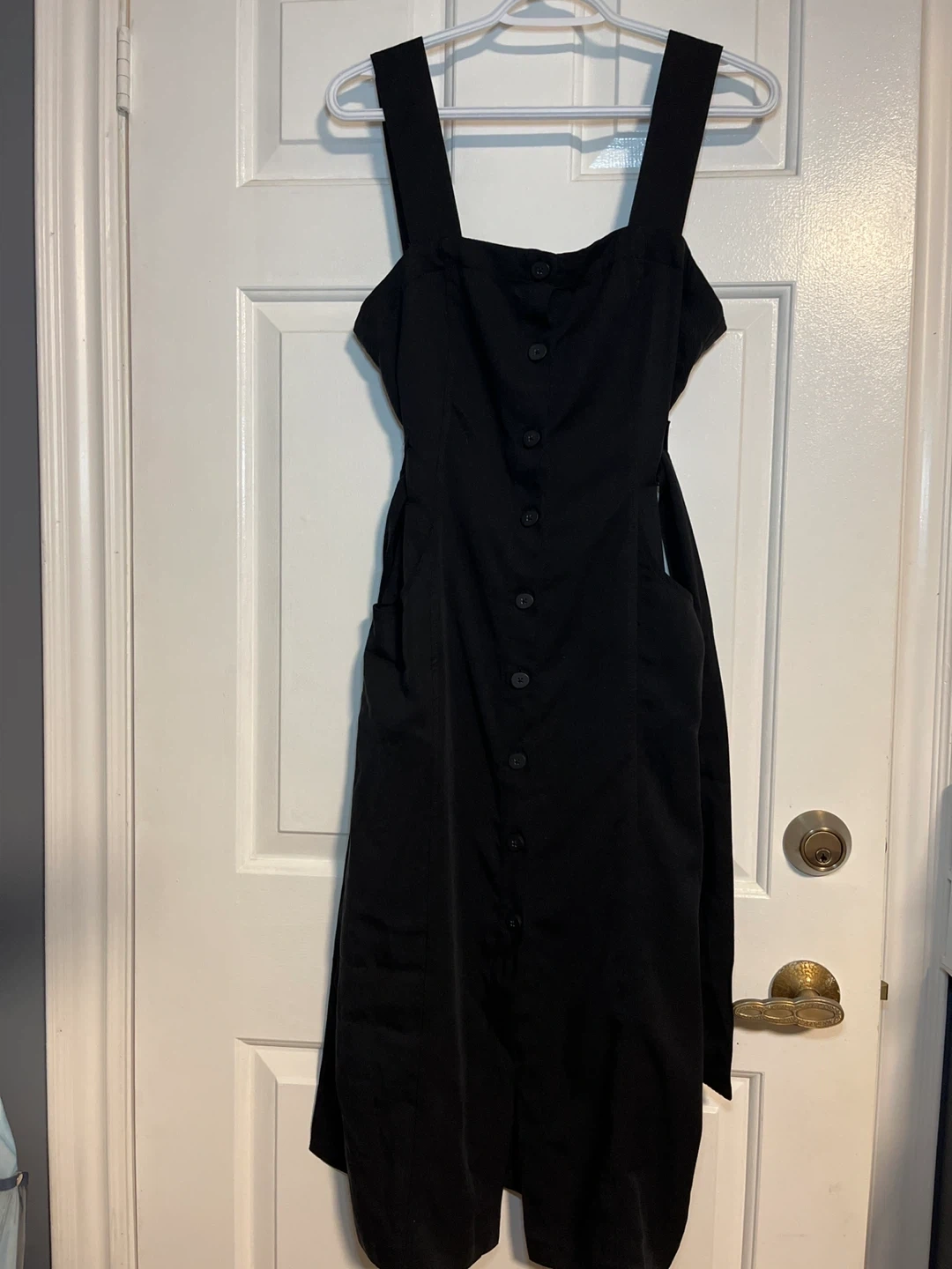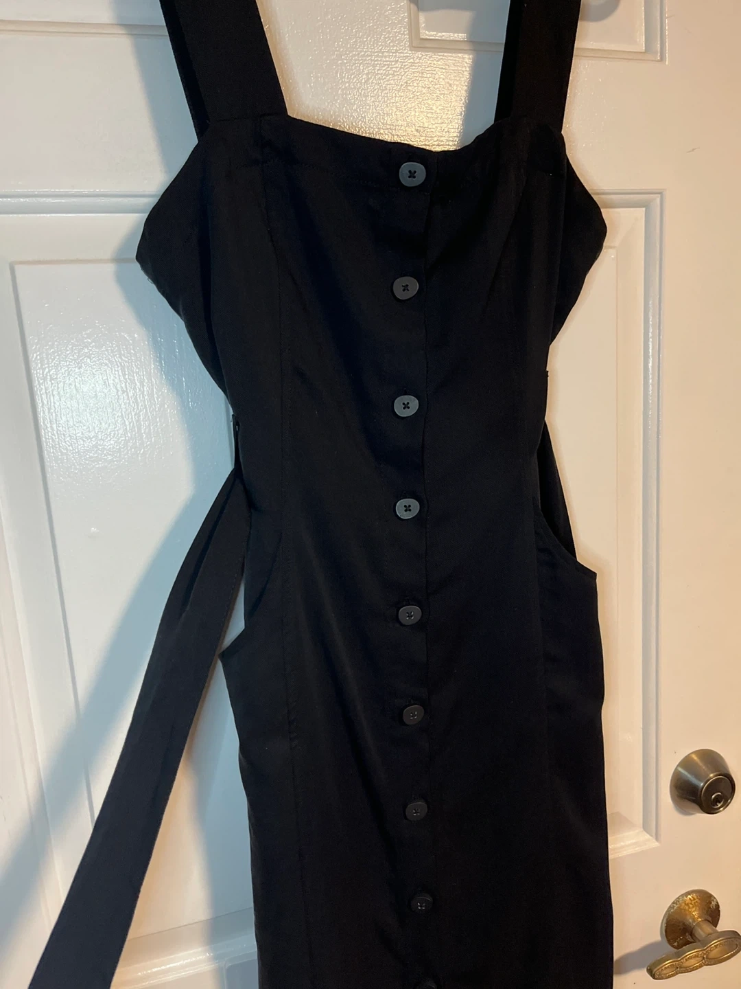 Selling a stylish black Zara TRF collection dress in size M. It features a button-down front , with pockets on both sides and a tie waist. Originally bought for $49.90!