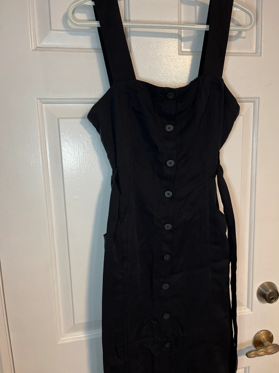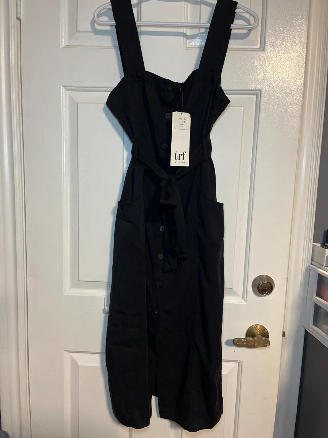 Selling a stylish black Zara TRF collection dress in size M. It features a button-down front , with pockets on both sides and a tie waist. Originally bought for $49.90!