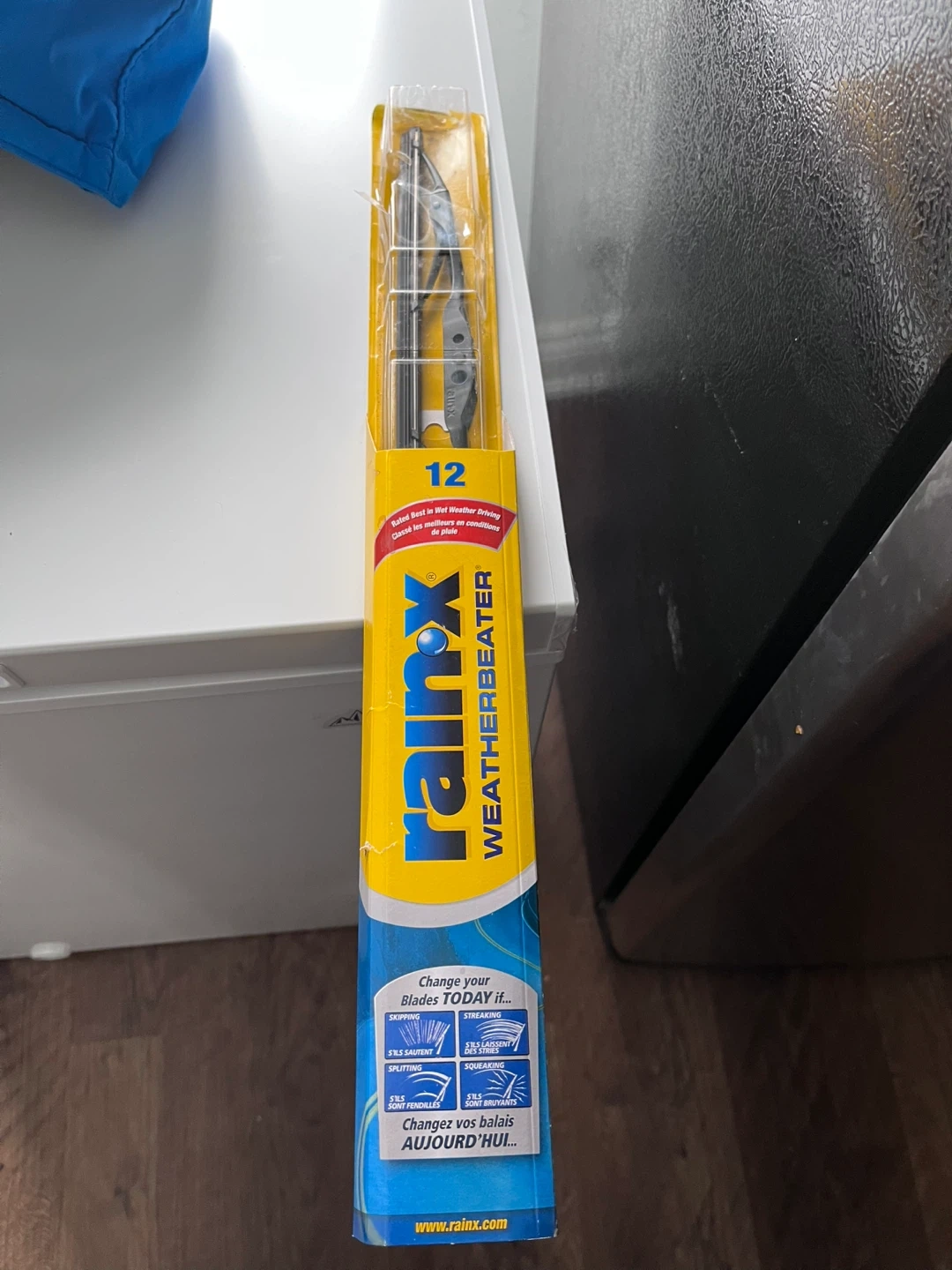 This is a 12-inch Rain-X Weatherbeater wiper blade. It's rated best in wet weather driving. The blade is designed to prevent skipping, streaking, splitting, and squeaking.