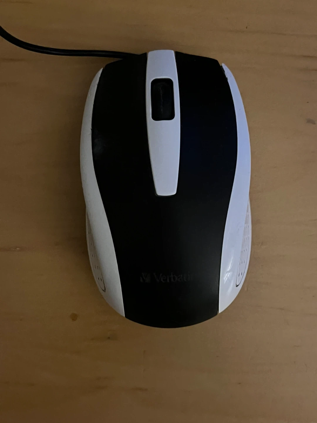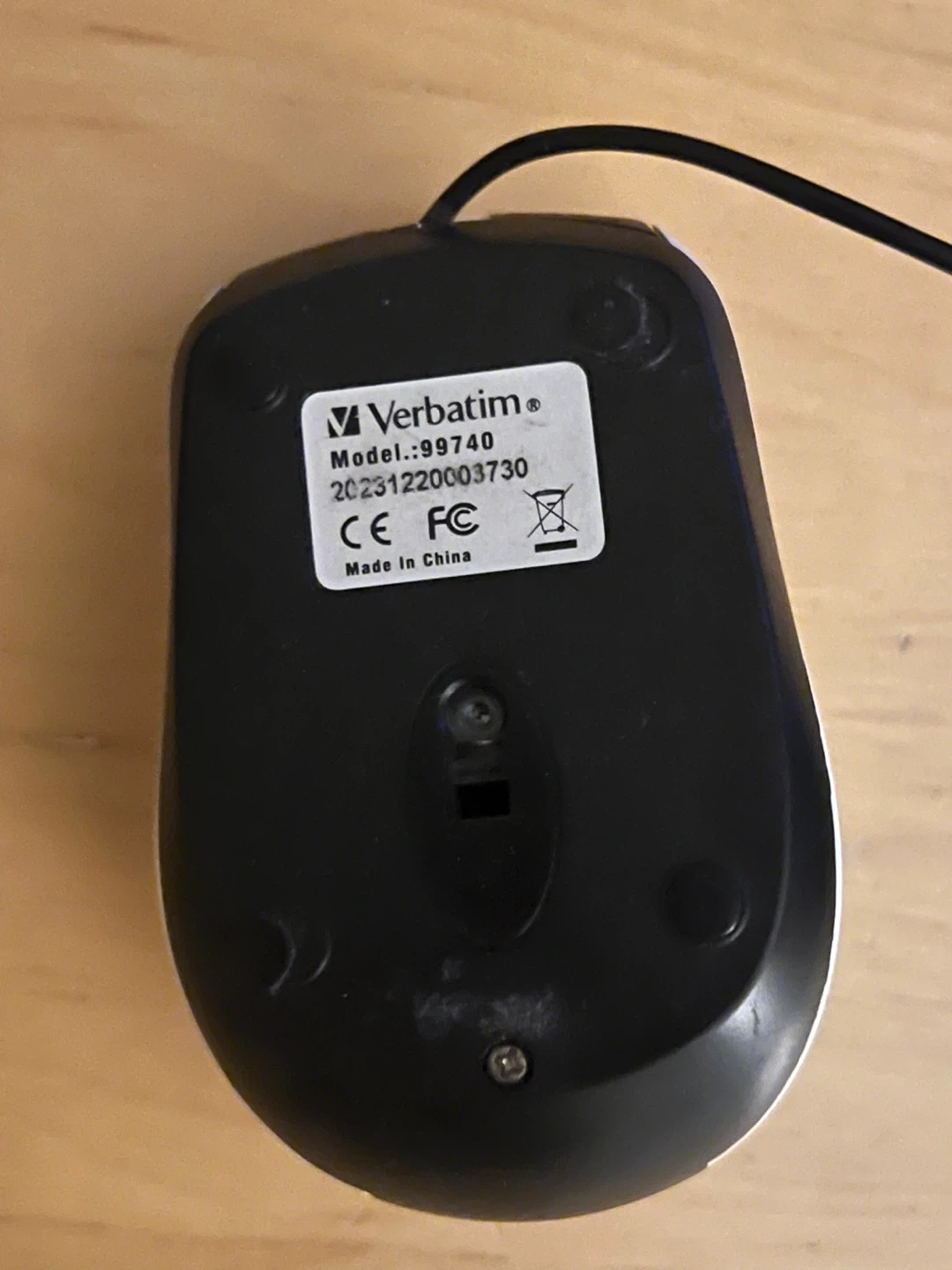 This is a white and black Verbatim wired computer mouse. It's model number 99740 and was made in China. It's a reliable peripheral for your desktop or laptop.