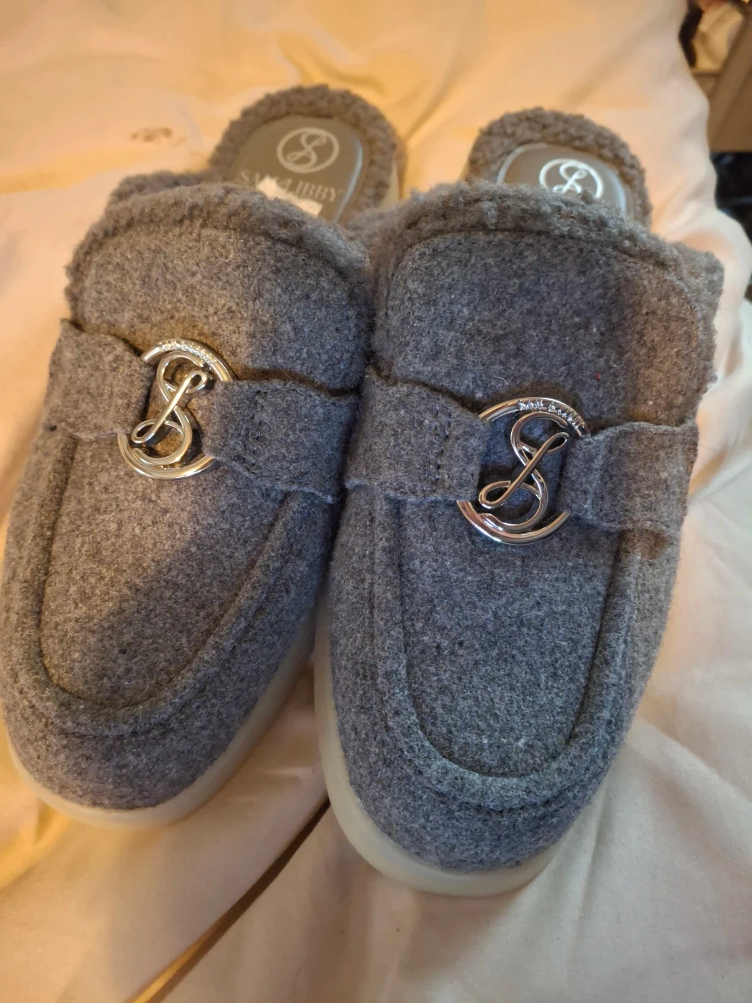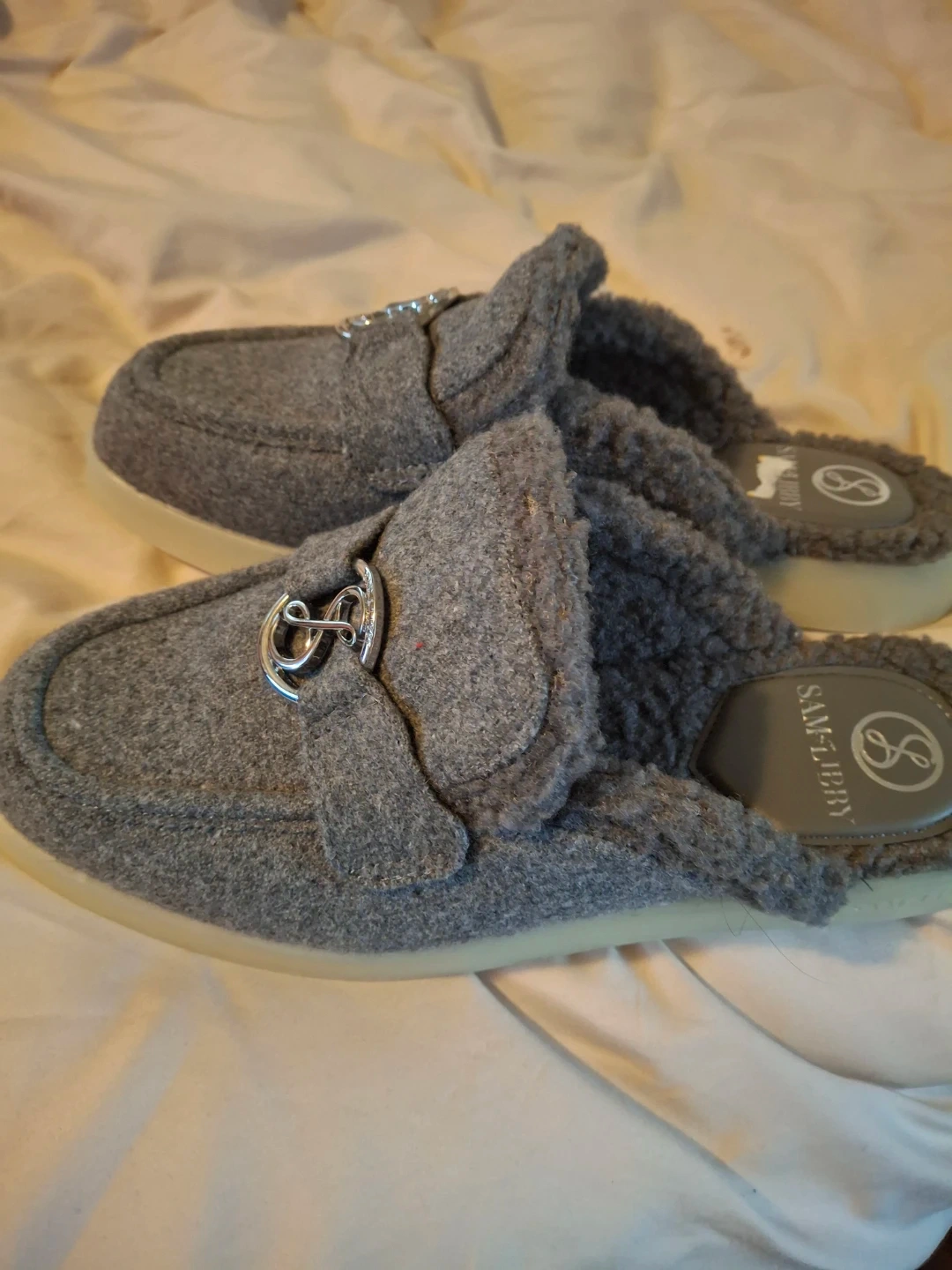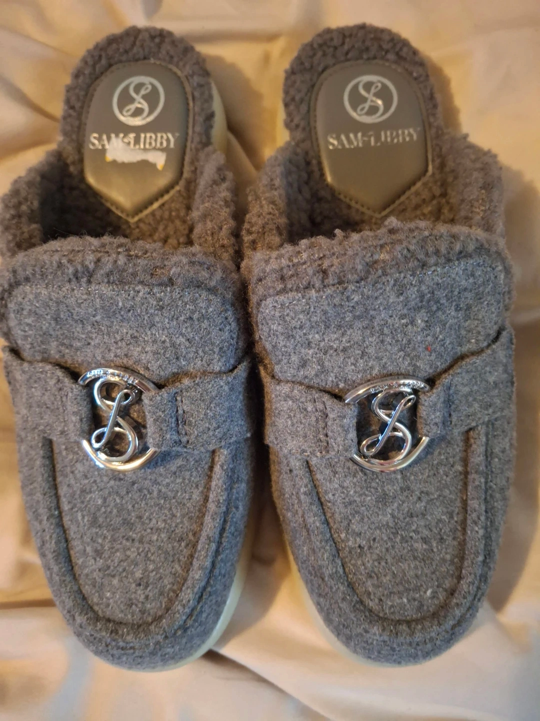 Selling a pair of Sam & Libby slippers in gray. They appear to be made of a wool blend and are in great condition. These cozy slippers are perfect for lounging around the house!
