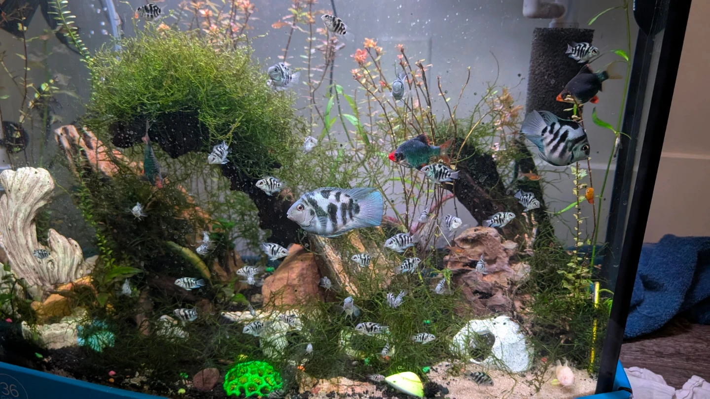 A diverse collection of tropical fish tank 36 gallon top fin bow front.