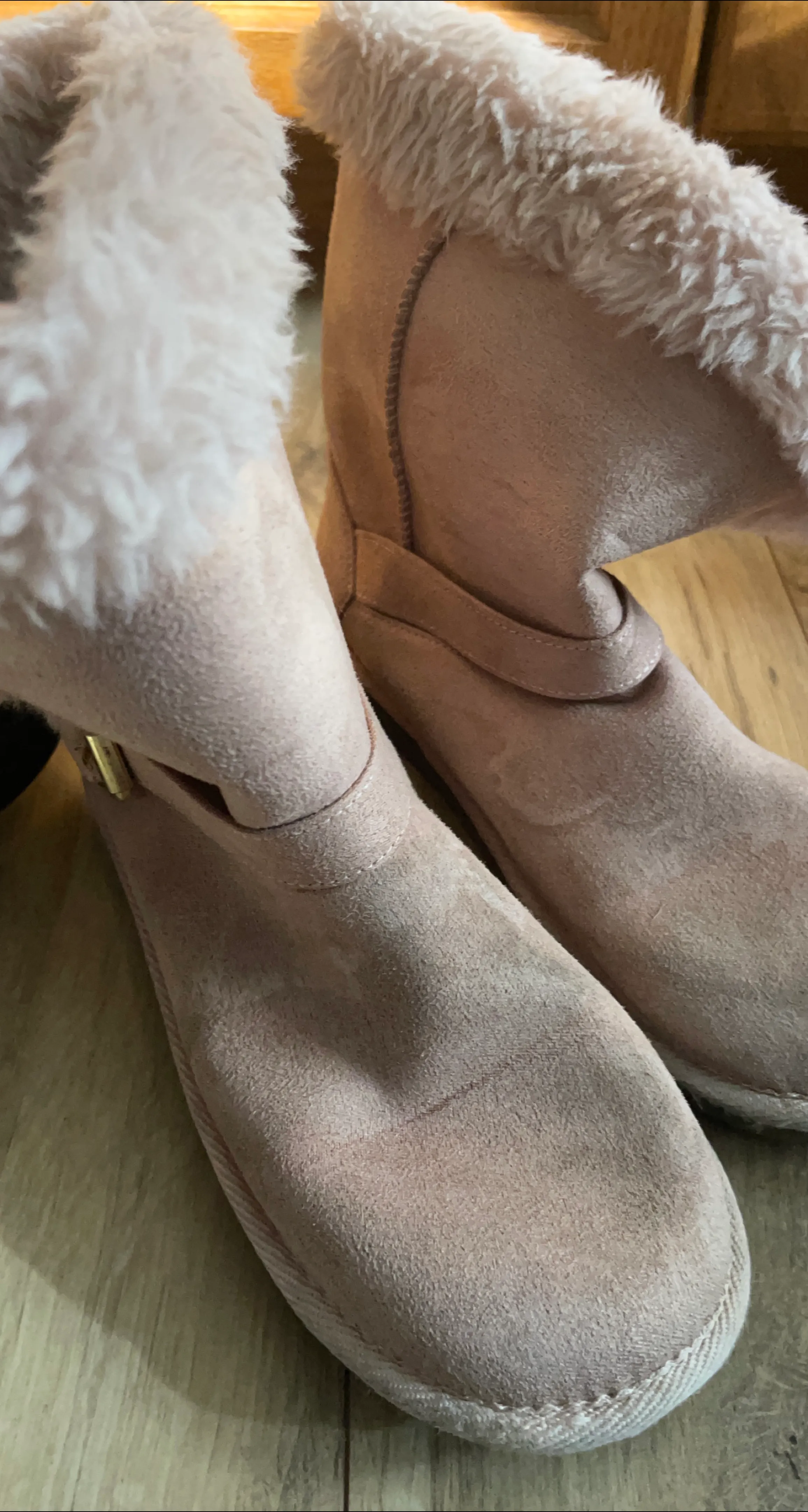 These are a pair of pink, faux suede winter boots. They feature a soft, furry trim and a buckle detail. Perfect for keeping your feet warm and cozy during the colder months!
