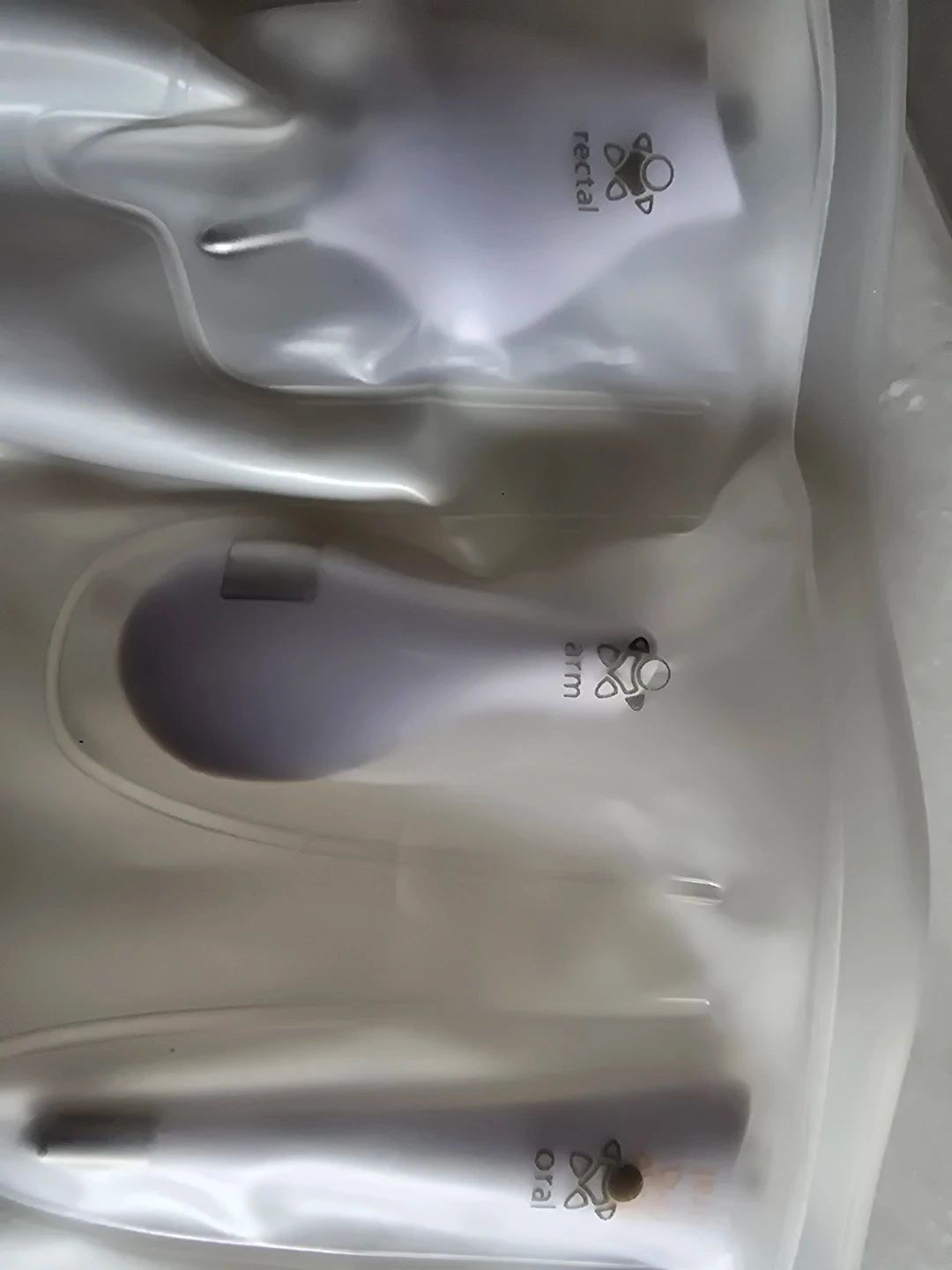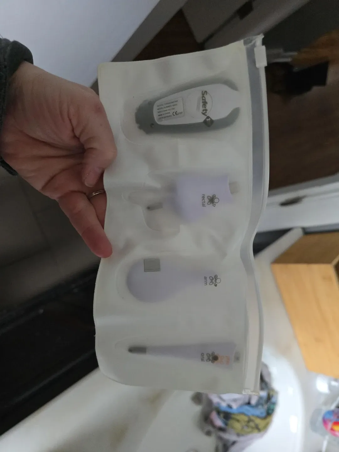 This Safety 1st 3-in-1 digital thermometer set includes oral, arm, and rectal thermometers. It's designed for quick and accurate temperature readings. The set comes in a handy storage pouch.