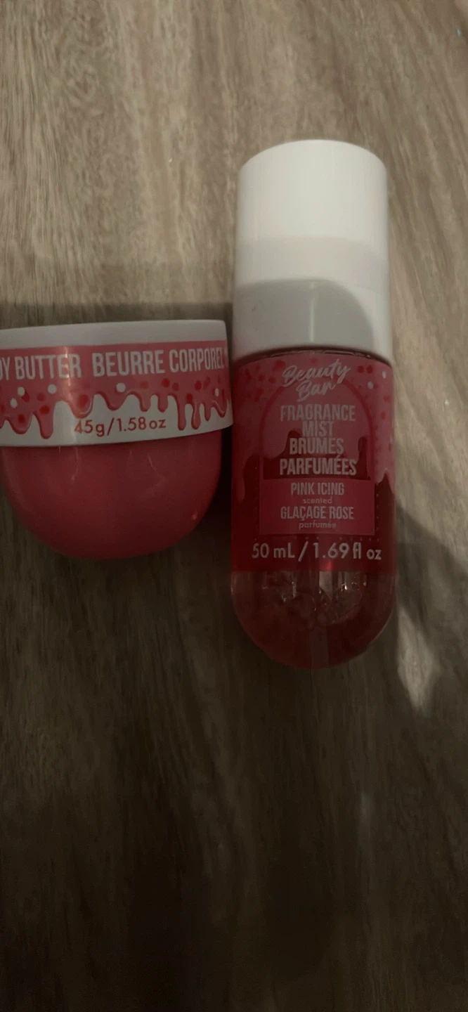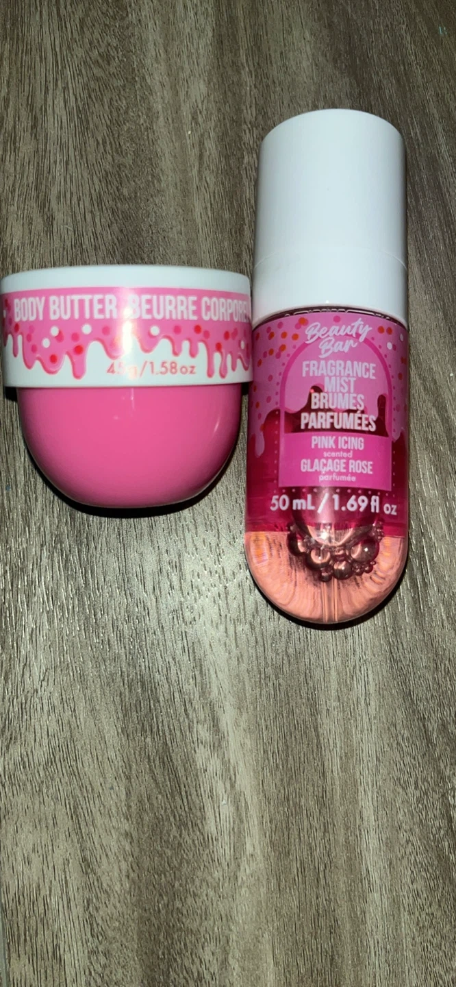 Pick up only please and thank you just want gone asap Set includes a Beauty Bar Pink Icing Fragrance Mist, 50ml/1.69 fl oz, and a 45g/1.58 oz Body Butter. Both items are in a pink, sweet-themed design. Great for a personal treat!