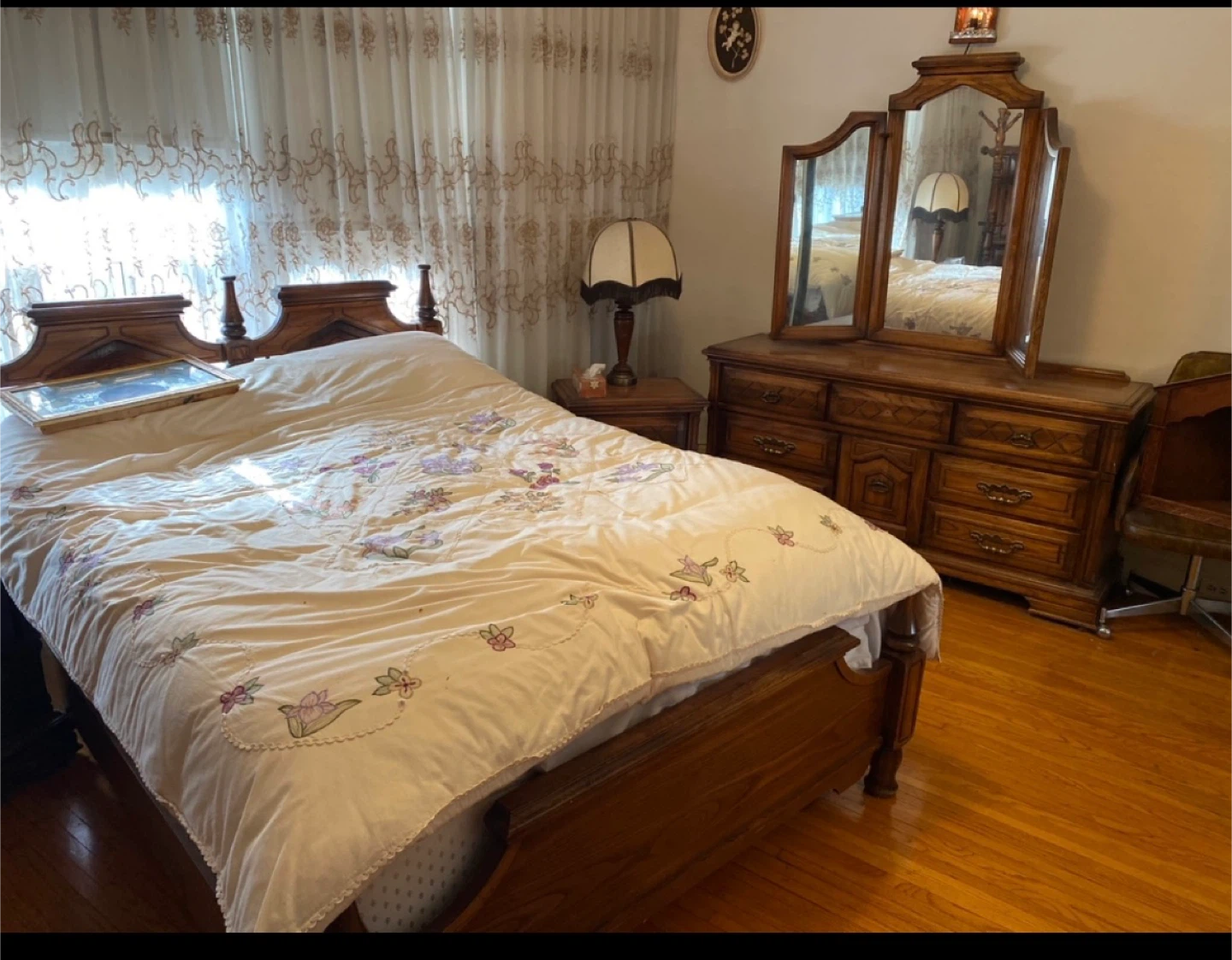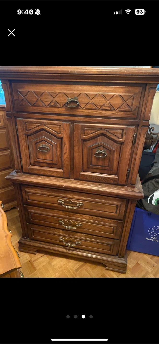 Selling a vintage wooden bedroom set. It includes a dresser with mirror , Two nightstand, one chest and a bed frame. The set has a classic design and is in good condition.