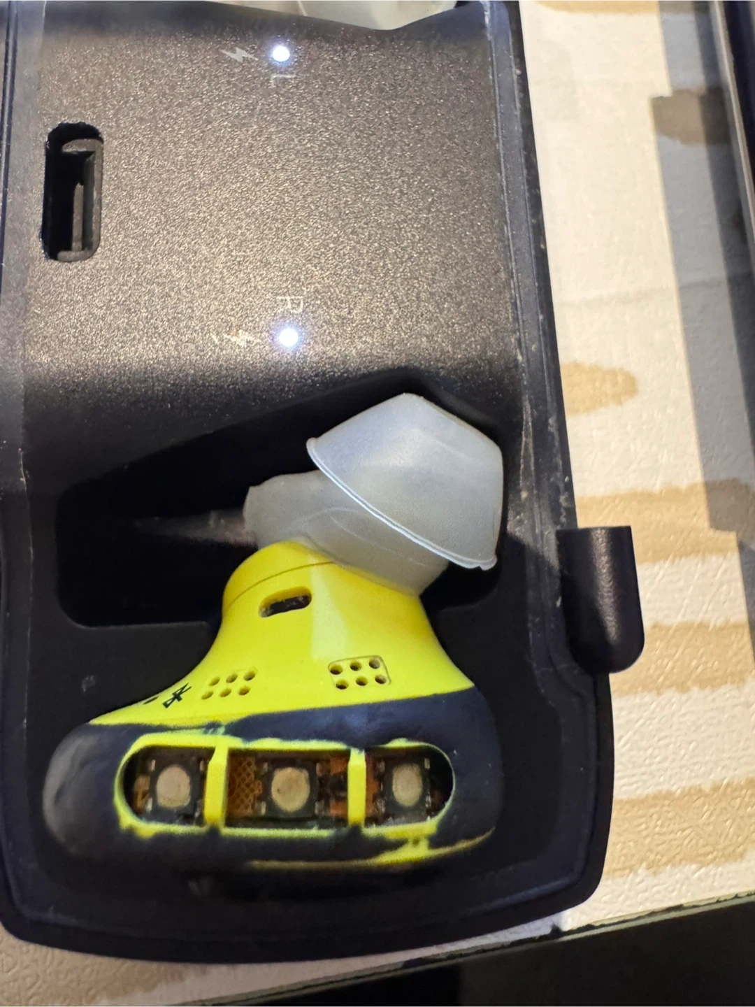 Please see the photos for details. The buttons rubber covers have come off. The earbuds sometimes need to be connected through the Bose app.