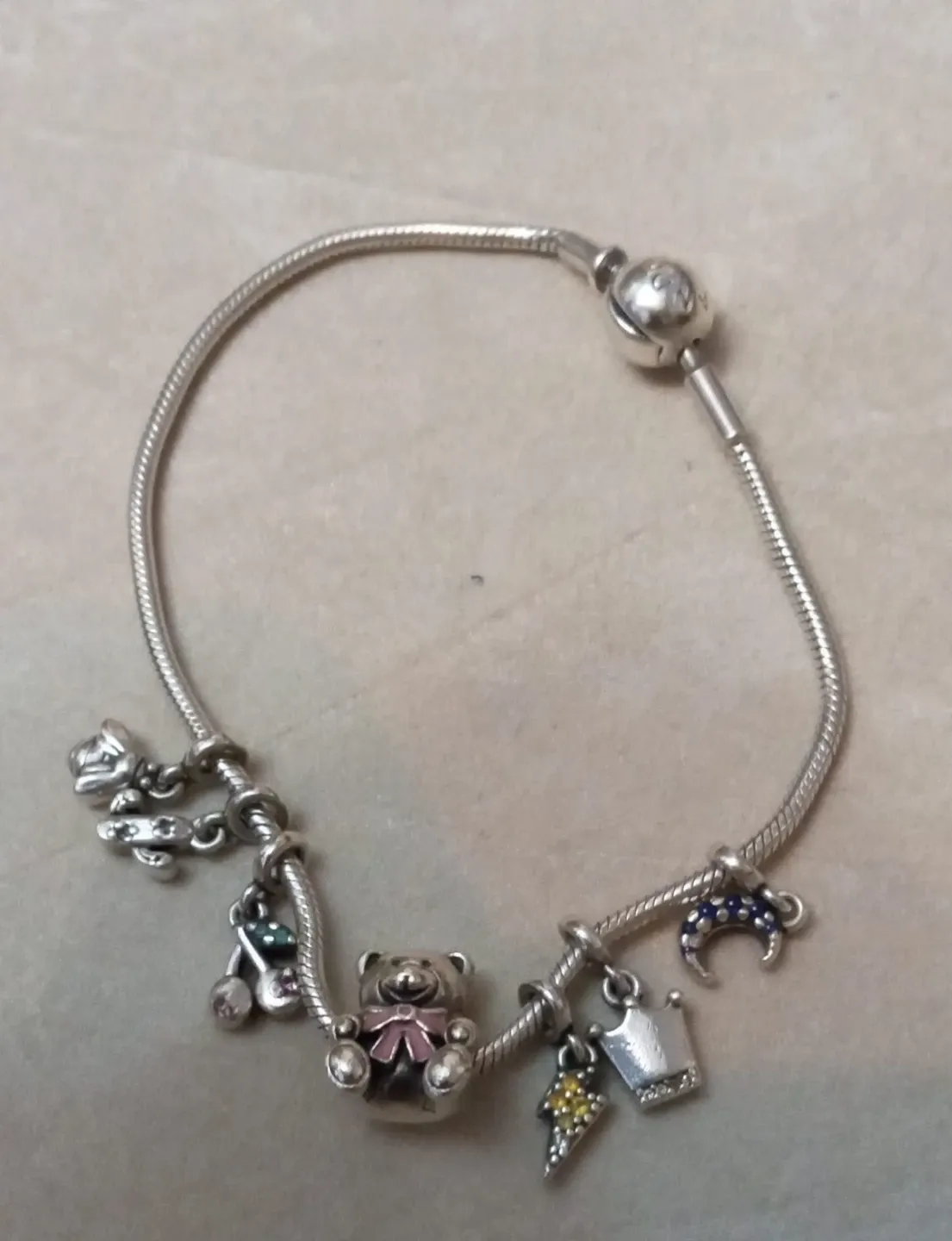 Selling a cute Pandora charm bracelet! It features a variety of charms including a teddy bear, crown, crescent moon, and other fun designs. It's in great condition and ready to wear